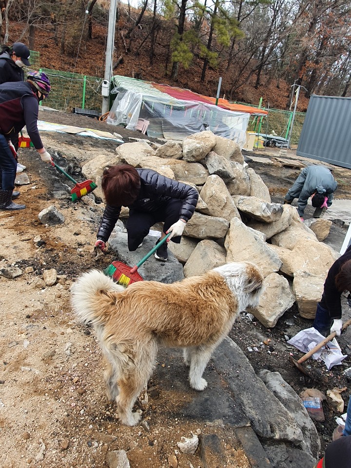 [허프포스트코리아] 한정애 환경부 장관이 배우 이용녀씨의 유기동물보호소에서 화재 복구 작업을 도왔다
