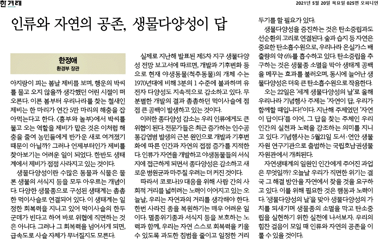 한정애 장관의 '인류와 자연의 공존, 생물다양성이 답' 기고문이 5월 20일자 한겨레신문에 게재되었습니다.