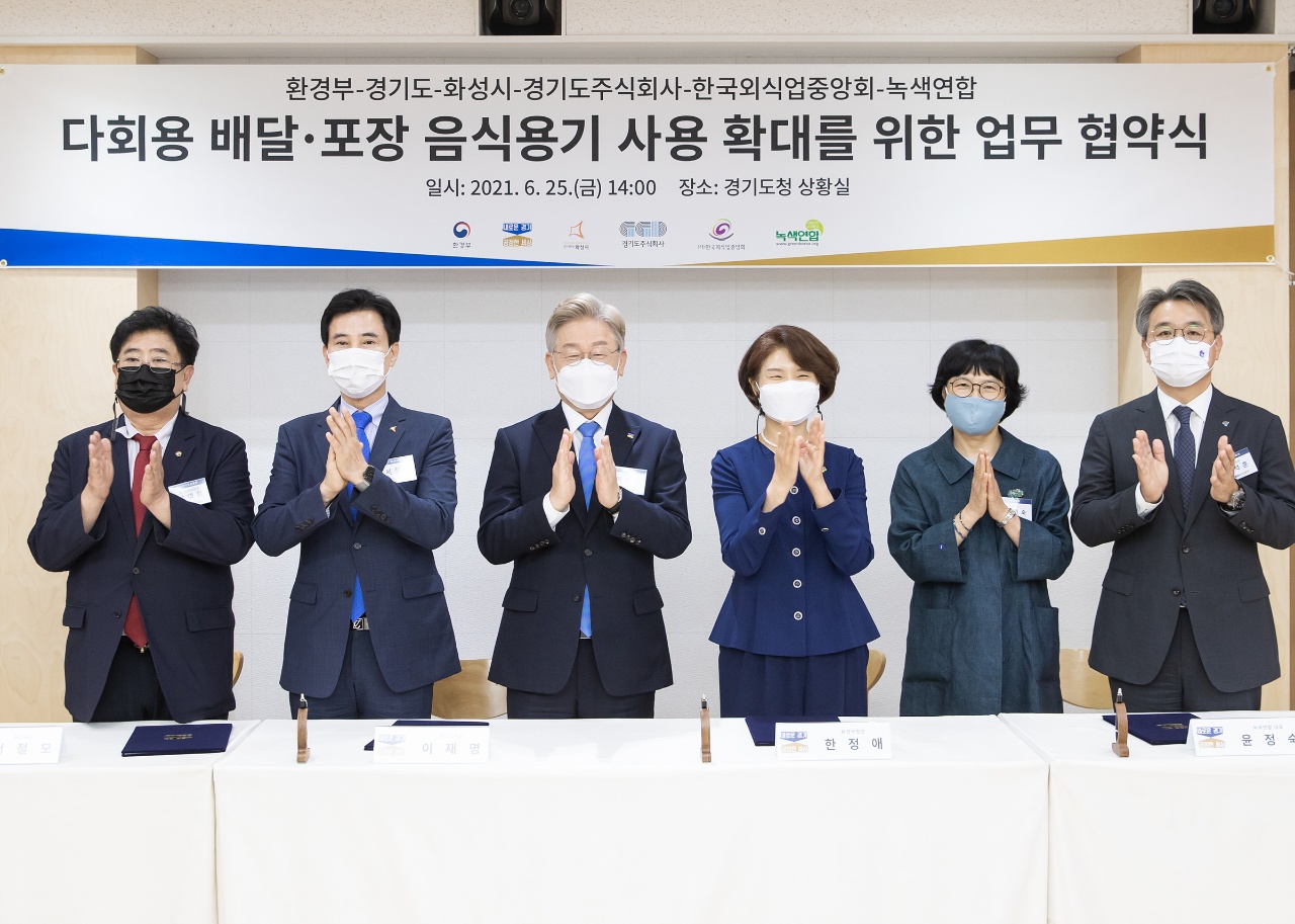 이석훈 경기도주식회사 대표이사, 윤정숙 녹색연합 대표와 <다회용 배달·포장용기 사용 업무협약>을 체결하고
