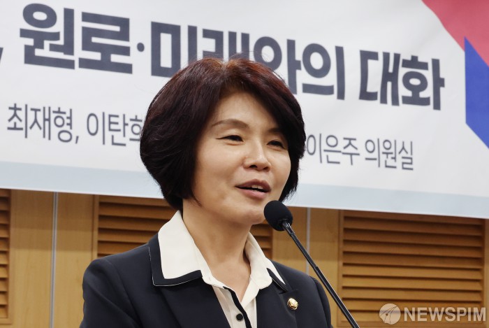 [서울=뉴스핌] 이형석 기자 =  한정애  더불어민주당 의원이 19일 오후 서울 여의도 국회 의원회관에서 열린 새로운 질서 포럼의 '정치교제와 정치복원, 원로·미래와의 대화'에서 축사를 하고 있다. 2023.07.19 leehs@newspim.com