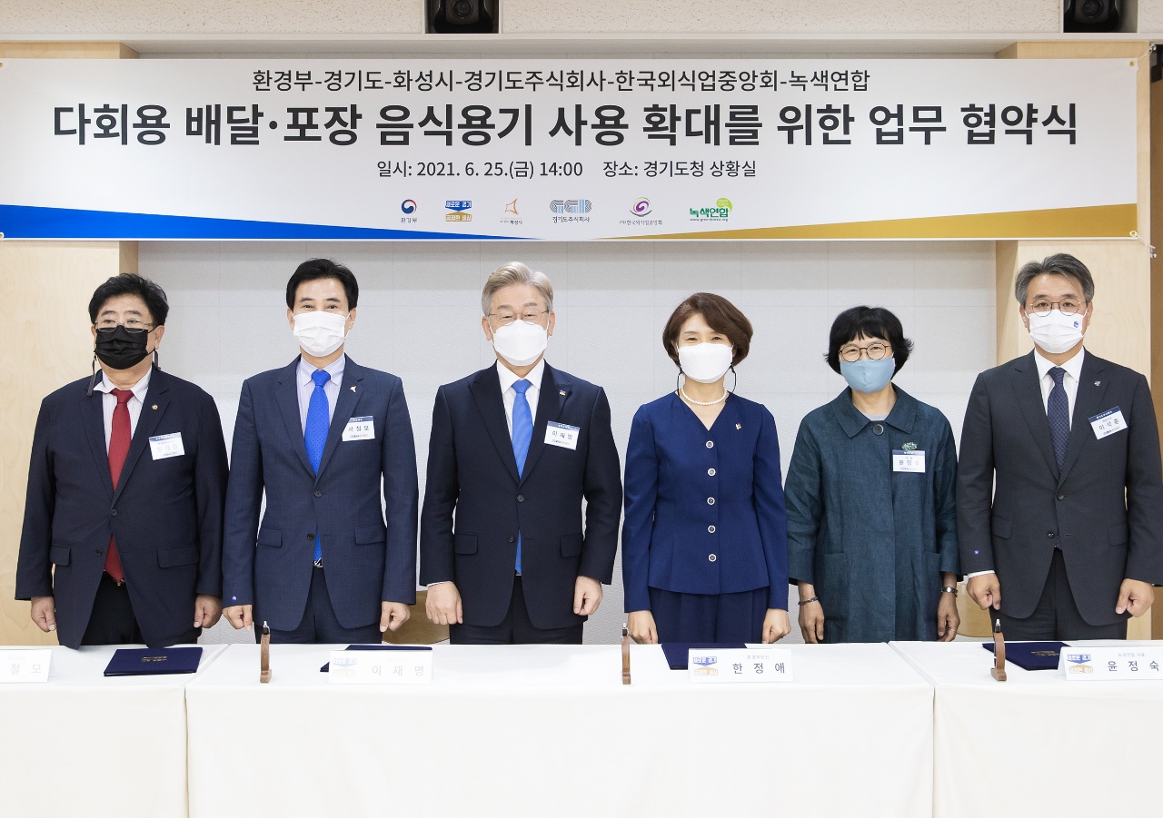 이석훈 경기도주식회사 대표이사, 윤정숙 녹색연합 대표와 <다회용 배달·포장용기 사용 업무협약>을 체결하고