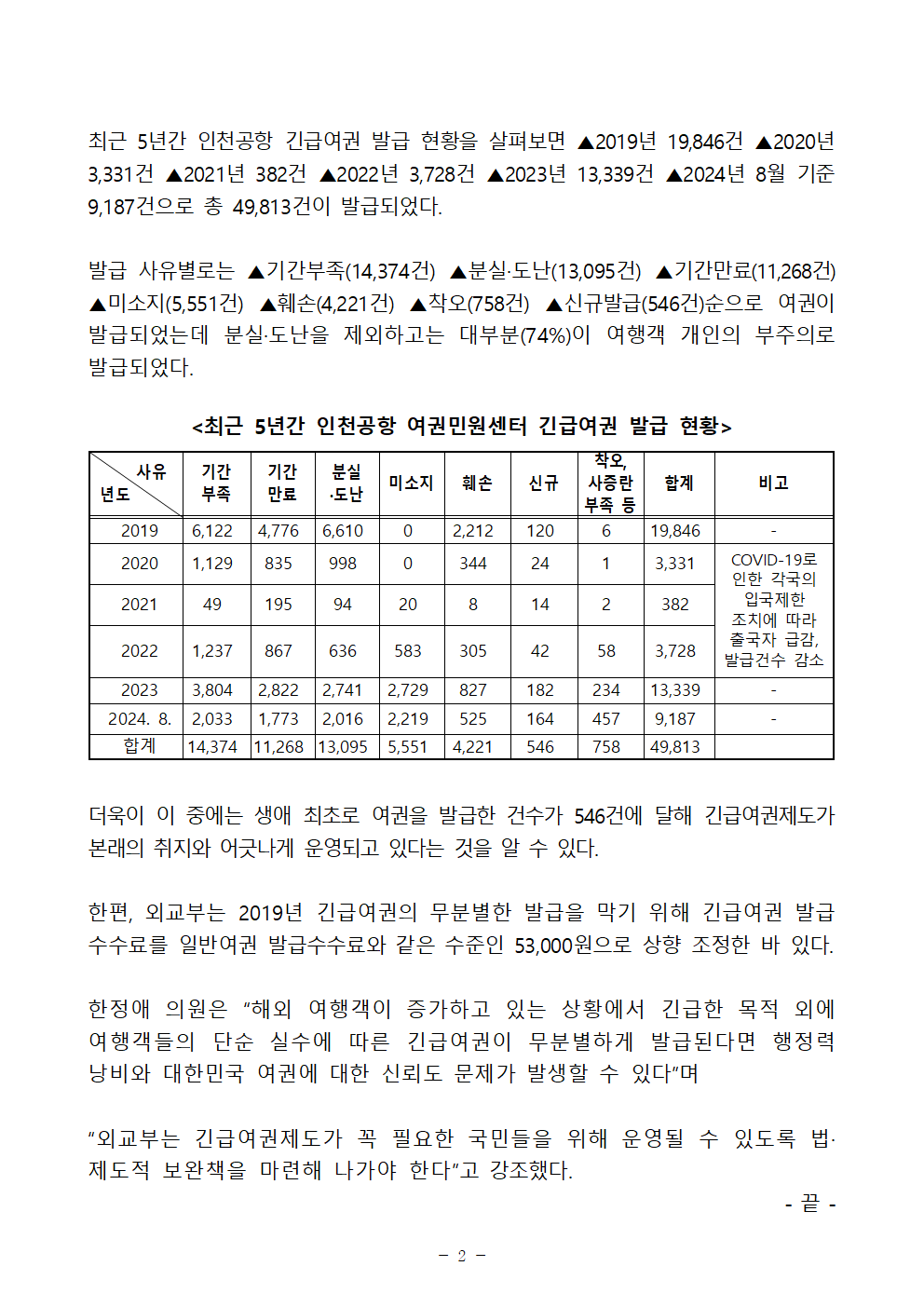 [보도자료] 한정애 의원, 인천공항 긴급여권 대부분(74%)은 여행객 부주의로 발급!