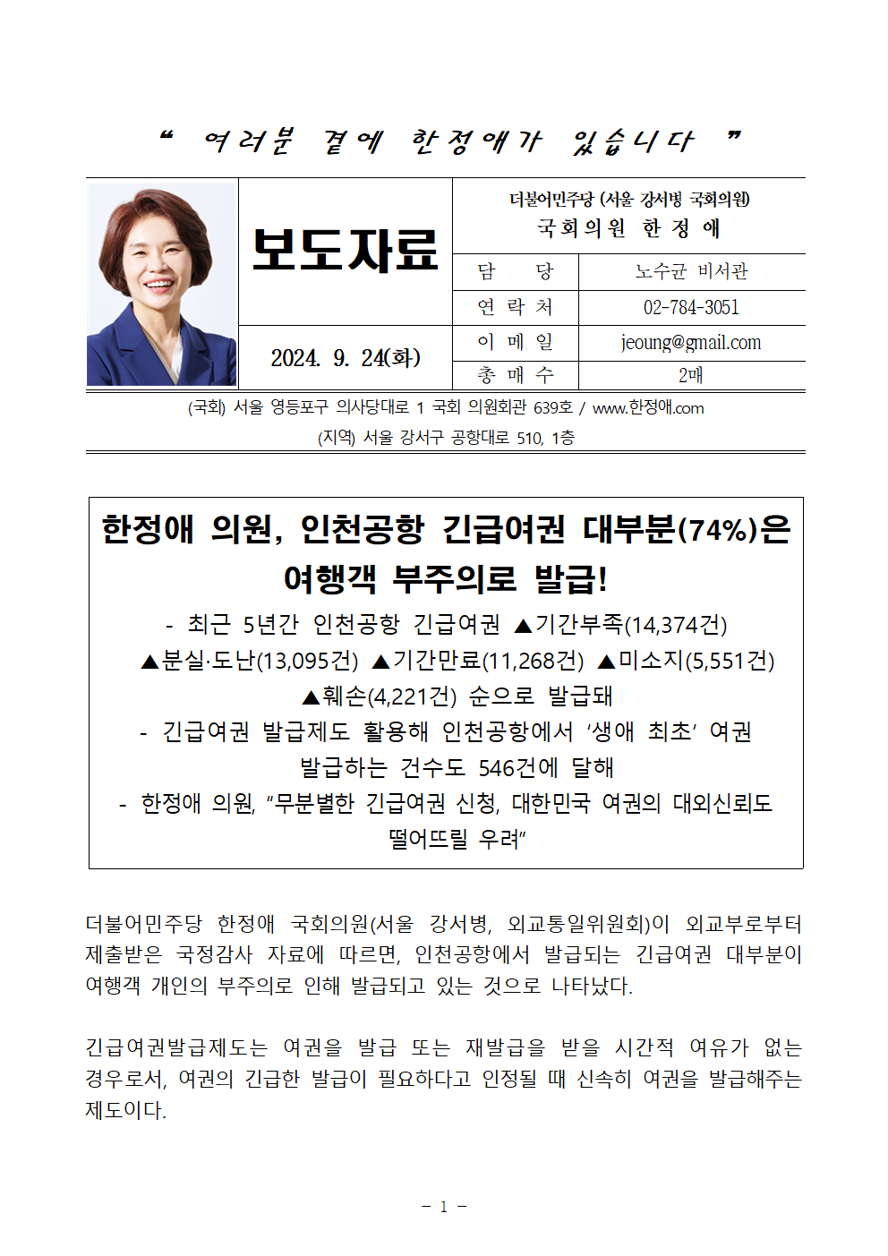 240924_[한정애의원 국정감사 보도자료]_인천공항 긴급여권 대부분(74%)은 여행객 부주의로 발급!.hwp