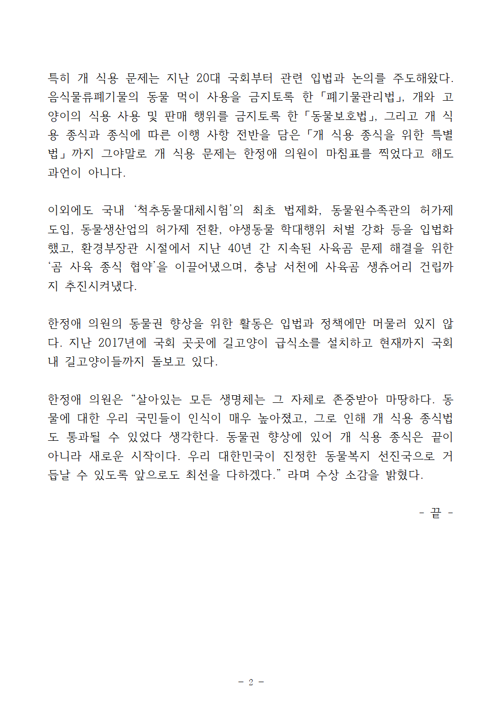 한정애 의원은 “살아있는 모든 생명체는 그 자체로 존중받아 마땅하다. 동물에 대한 우리 국민들이 인식이 매우 높아졌고, 그로 인해 개 식용 종식법도 통과될 수 있었다 생각한다. 동물권 향상에 있어 개 식용 종식은 끝이 아니라 새로운 시작이다. 우리 대한민국이 진정한 동물복지 선진국으로 거듭날 수 있도록 앞으로도 최선을 다하겠다.” 라며 수상 소감을 밝혔다.