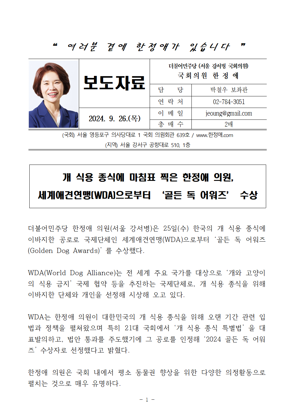 더불어민주당 한정애 의원(서울 강서병)은 25일(수) 한국의 개 식용 종식에 이바지한 공로로 국제단체인 세계애견연맹(WDA)으로부터 ‘골든 독 어워즈(Golden Dog Awards)’ 를 수상했다.