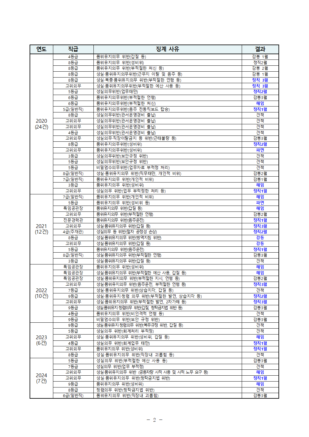 더불어민주당 한정애 국회의원(서울 강서병, 외교통일위원회)이 외교부로부터 제출받은 ‘최근 5년간 외교부 소속 공무원 징계 현황’ 자료에 따르면, 외무공무원 59명이 징계를 받았고 이들 중 절반은 파면, 해임 등 중징계 처분을 받은 것으로 확인됐다.