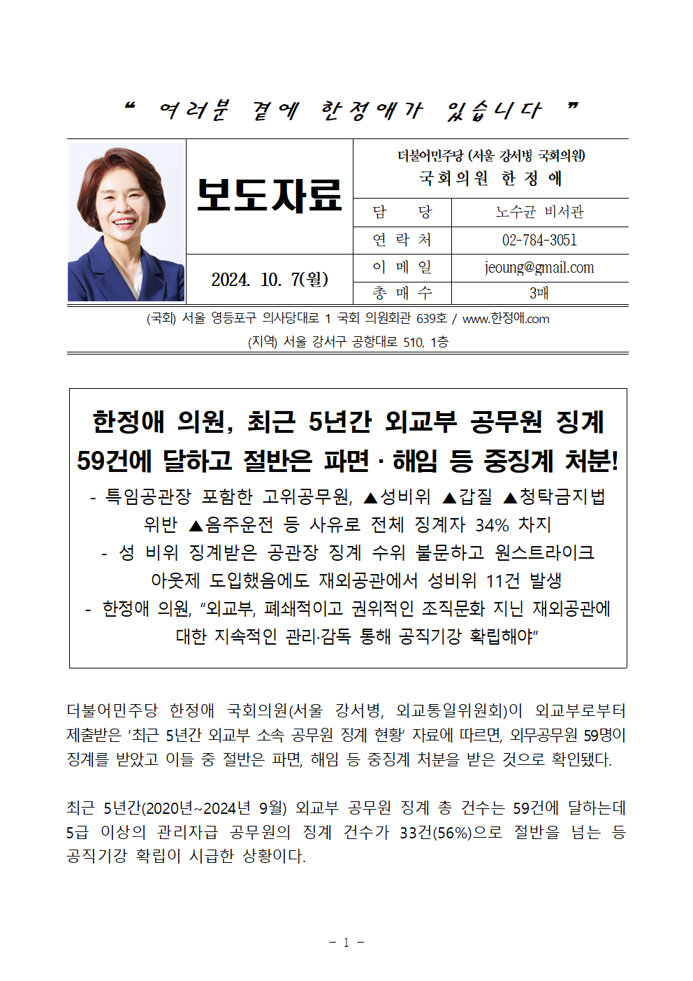 241007_[한정애의원 국정감사 보도자료]_최근 5년간 외교부 공무원 징계 59건에 달하고 절반은 파면·해임 등 중징계 처분!.hwp
