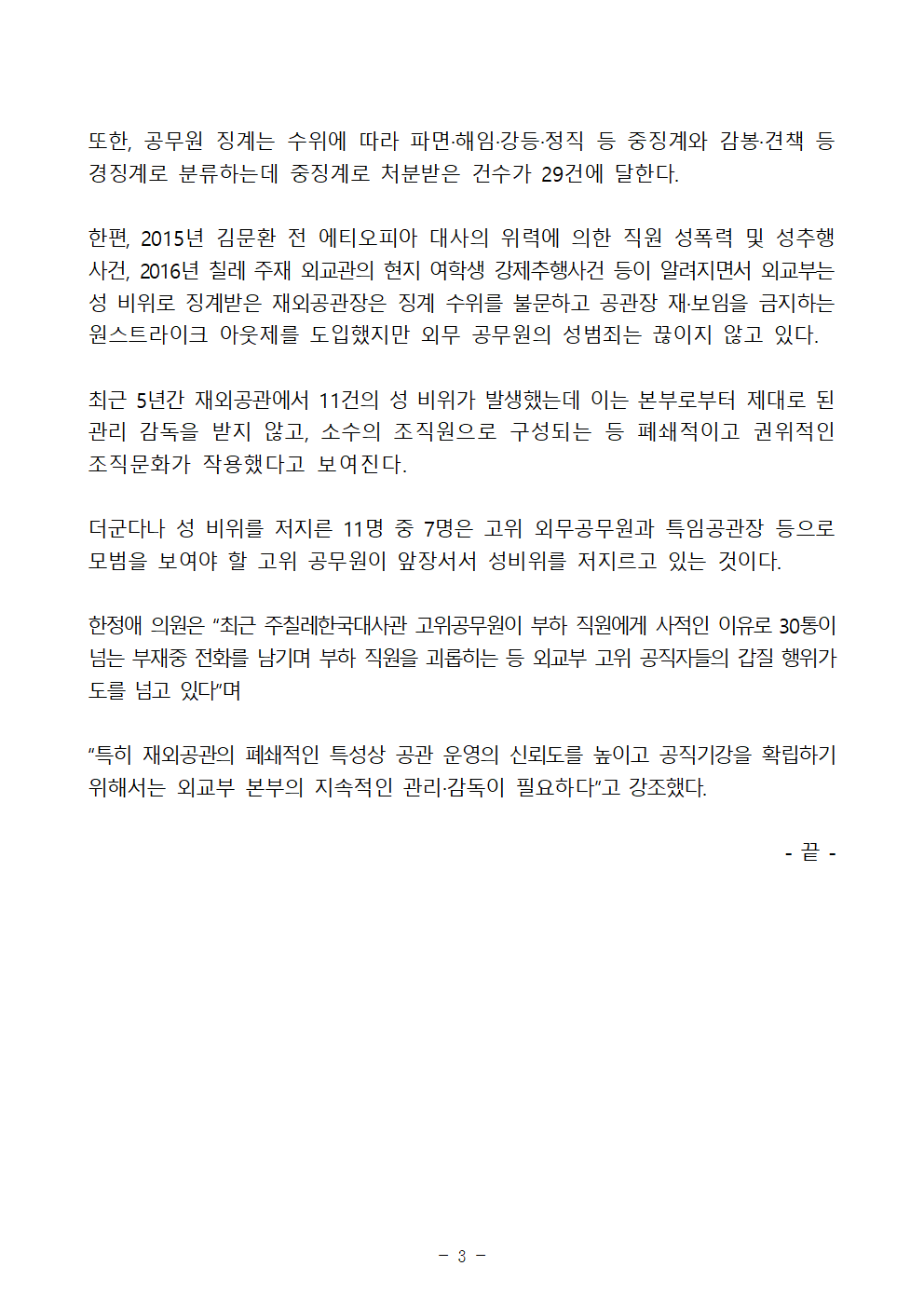 한정애 의원은 “최근 주칠레한국대사관 고위공무원이 부하 직원에게 사적인 이유로 30통이 넘는 부재중 전화를 남기며 부하 직원을 괴롭히는 등 외교부 고위 공직자들의 갑질 행위가 도를 넘고 있다”며