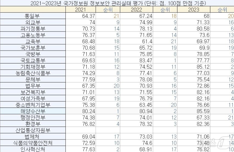 8일 국회 외교통일위원회 소속 한정애 더불어민주당 의원이 21개 부처로부터 제출받은 2021~2023년 '국가정보원 정보보안 관리 실태 평가'에 따르면 통일부는 3년 연속 평균 점수에 미치지 못했다.