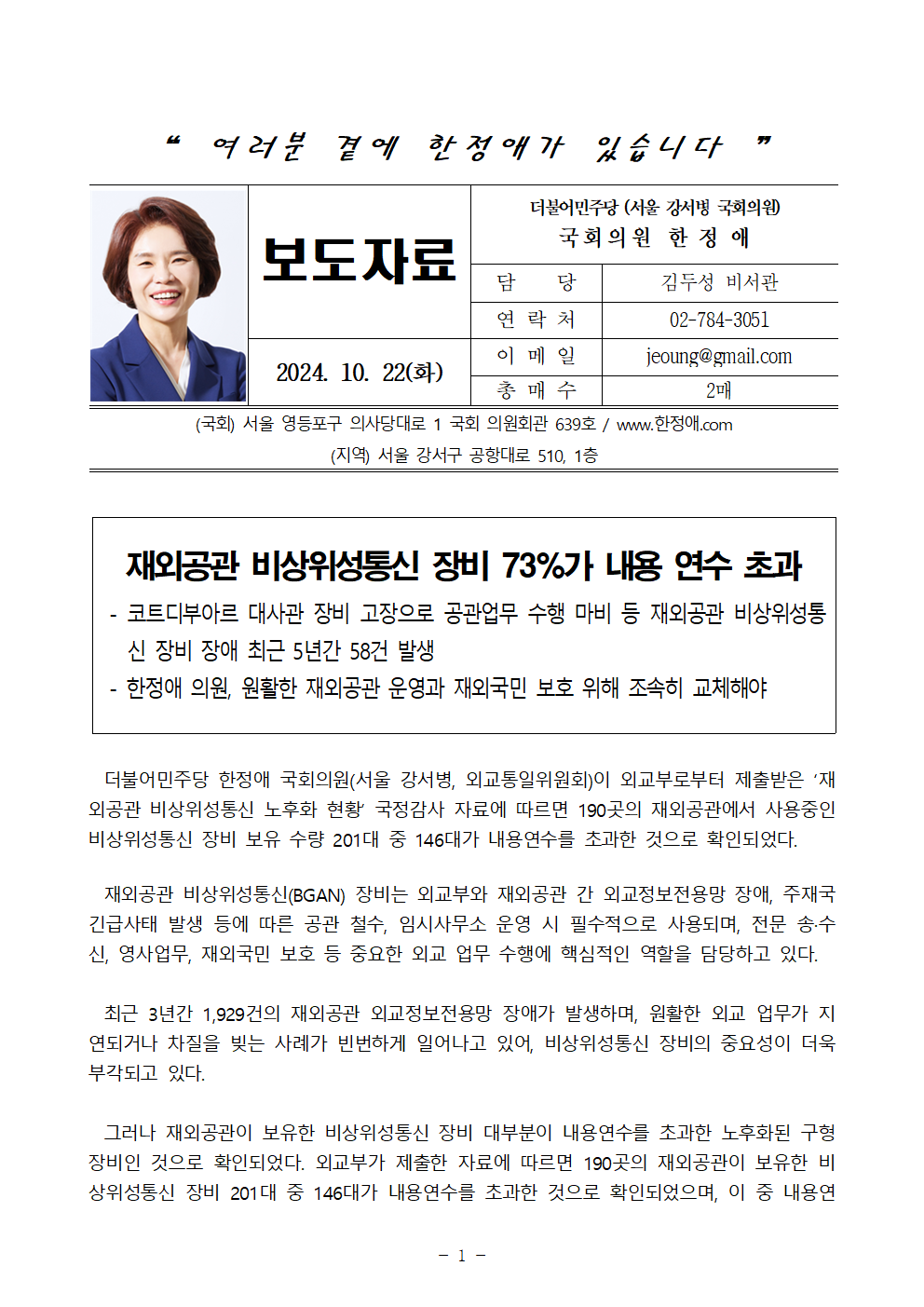 한정애 의원은 "비상위성통신 장비는 재외공관의 원활한 운영과 재외국민 보호에 필수적인 요소임에도 장비 노후화로 인해 공관운영에 차질이 발생하고 있다“고 지적하며, ”비상상황 시 공관 기본업무의 연속성을 확보하기 위해 노후화된 장비를 조속히 교체하고, 안정적인 통신망을 확보하여야 할 것“이라고 강조했다.