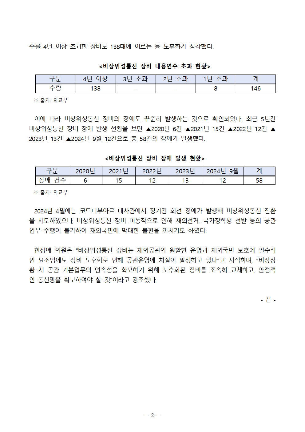 더불어민주당 한정애 국회의원(서울 강서병, 외교통일위원회)이 외교부로부터 제출받은 ‘재외공관 비상위성통신 노후화 현황’ 국정감사 자료에 따르면 190곳의 재외공관에서 사용중인 비상위성통신 장비 보유 수량 201대 중 146대가 내용연수를 초과한 것으로 확인되었다.