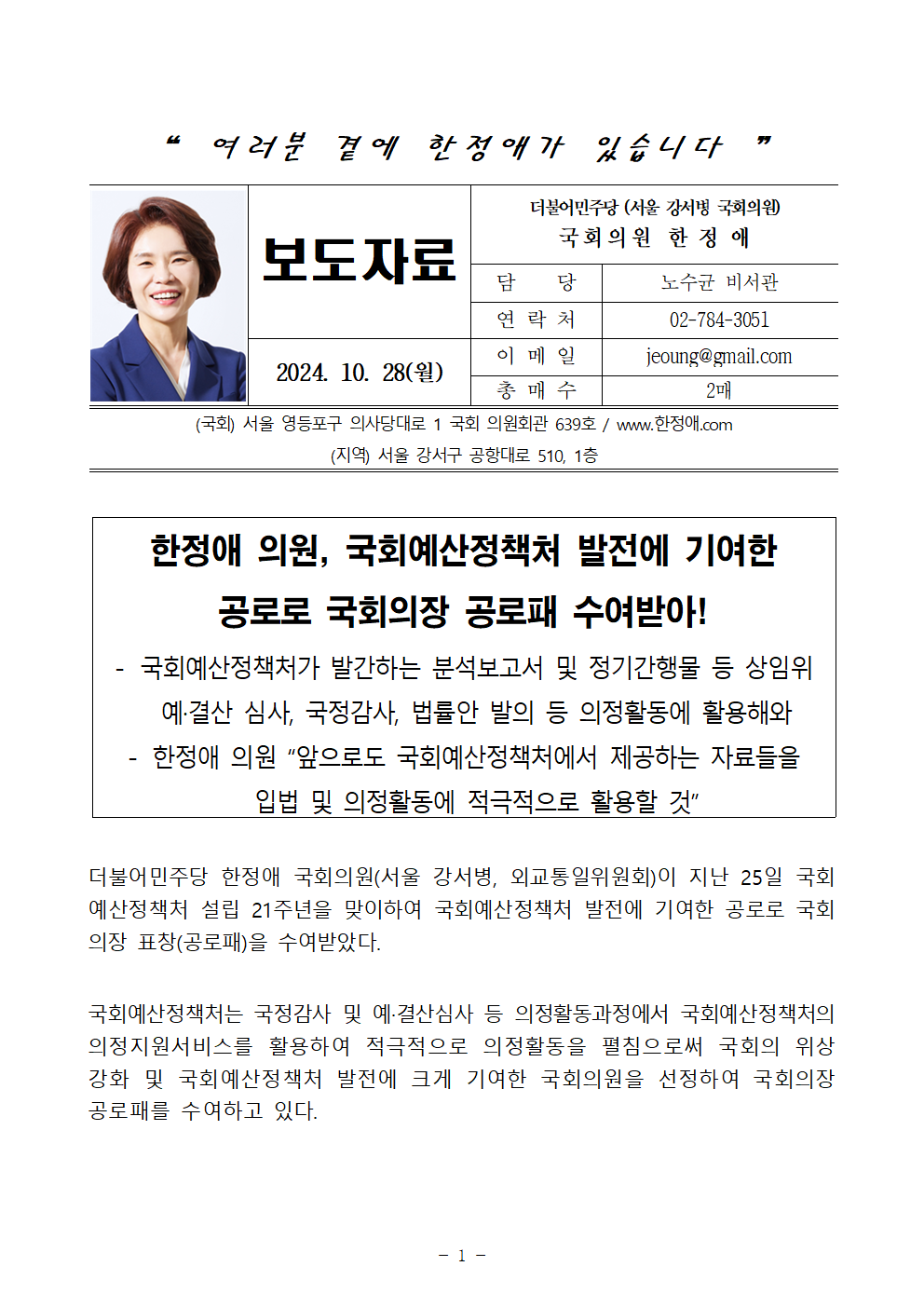 더불어민주당 한정애 국회의원(서울 강서병, 외교통일위원회)이 지난 25일 국회예산정책처 설립 21주년을 맞이하여 국회예산정책처 발전에 기여한 공로로 국회의장 표창(공로패)을 수여받았다.