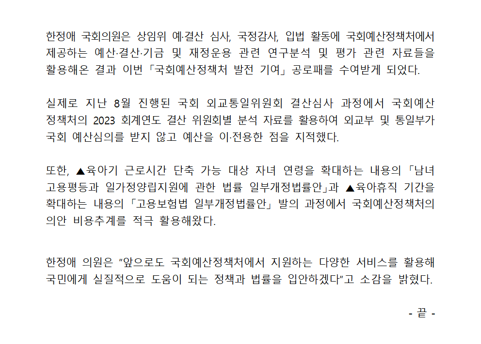 한정애 의원은 ”앞으로도 국회예산정책처에서 지원하는 다양한 서비스를 활용해 국민에게 실질적으로 도움이 되는 정책과 법률을 입안하겠다”고 소감을 밝혔다.