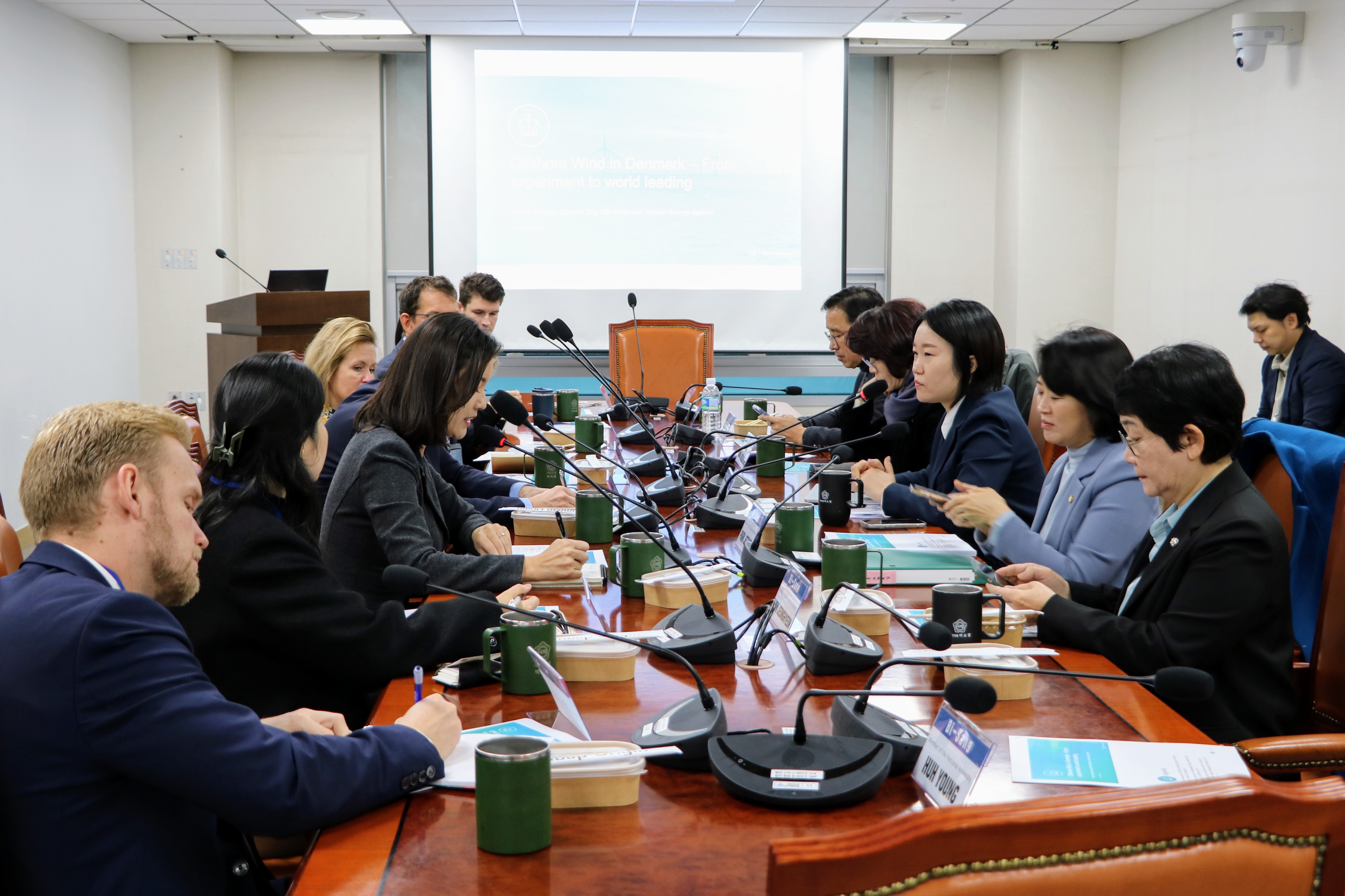 오늘 오전 비상 회의에서는 덴마크 에너지청 관계자들을 만나 덴마크의 해상풍력 발전 경험과 노하우에 대해 설명 듣고, 의견을 나눴습니다.