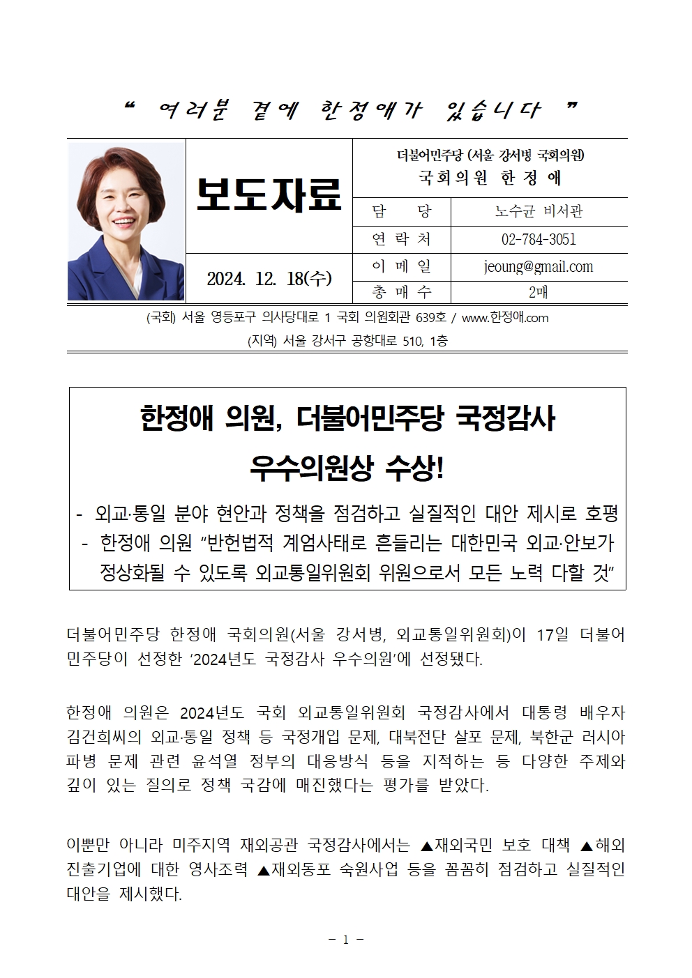 241218_[한정애의원 보도자료]_한정애 의원, 더불어민주당 국정감사 우수의원상 수상!.hwp