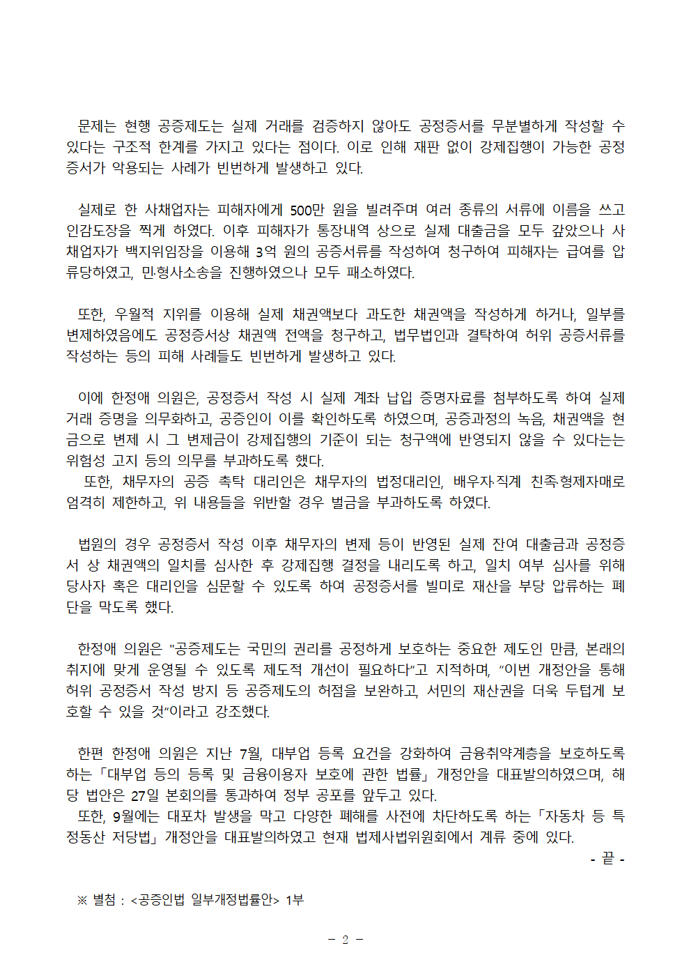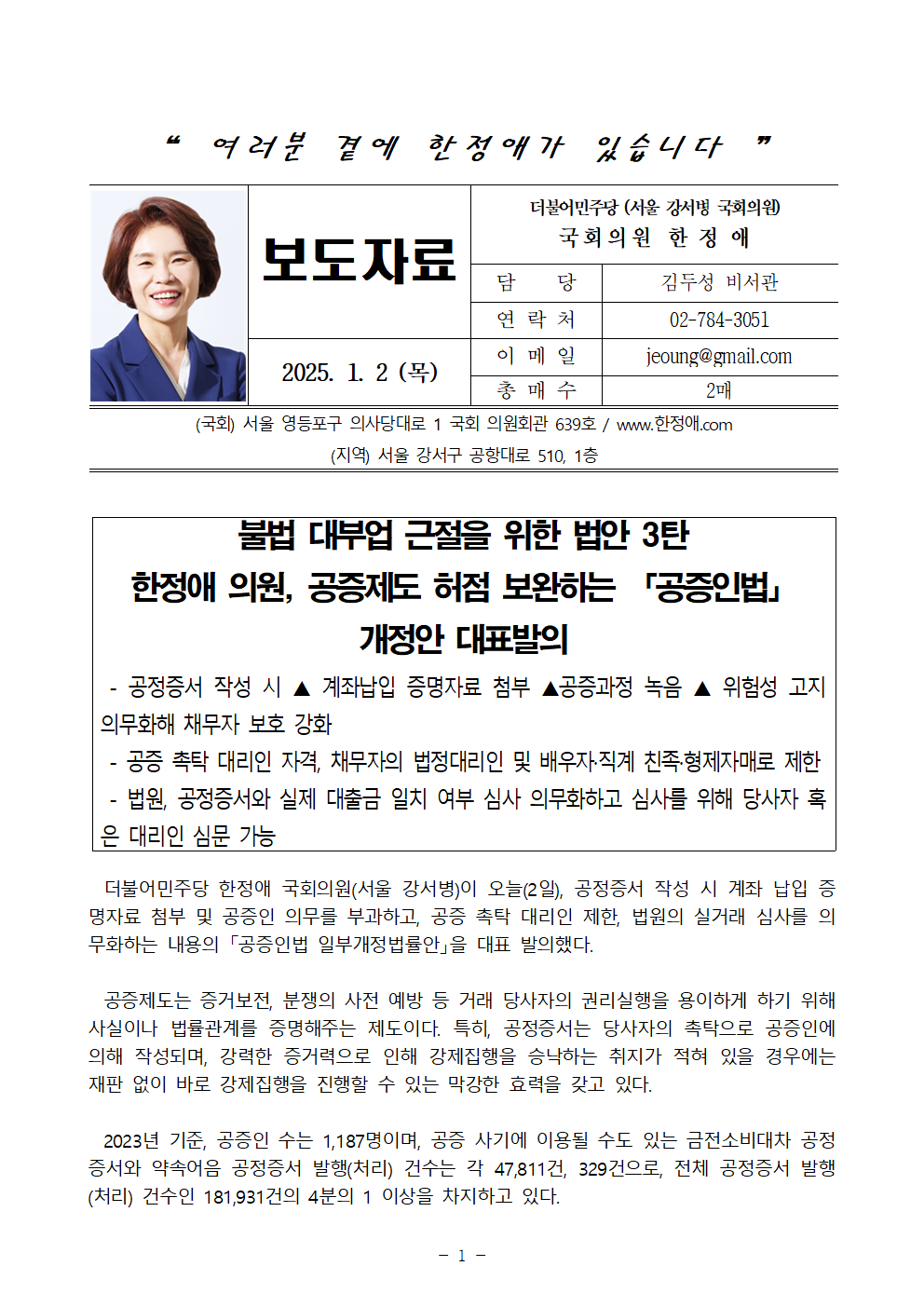 250102_불법 대부업 근절을 위한 민생 법안 2탄 한정애 의원, 「공증인법」 개정안 대표발의.hwp