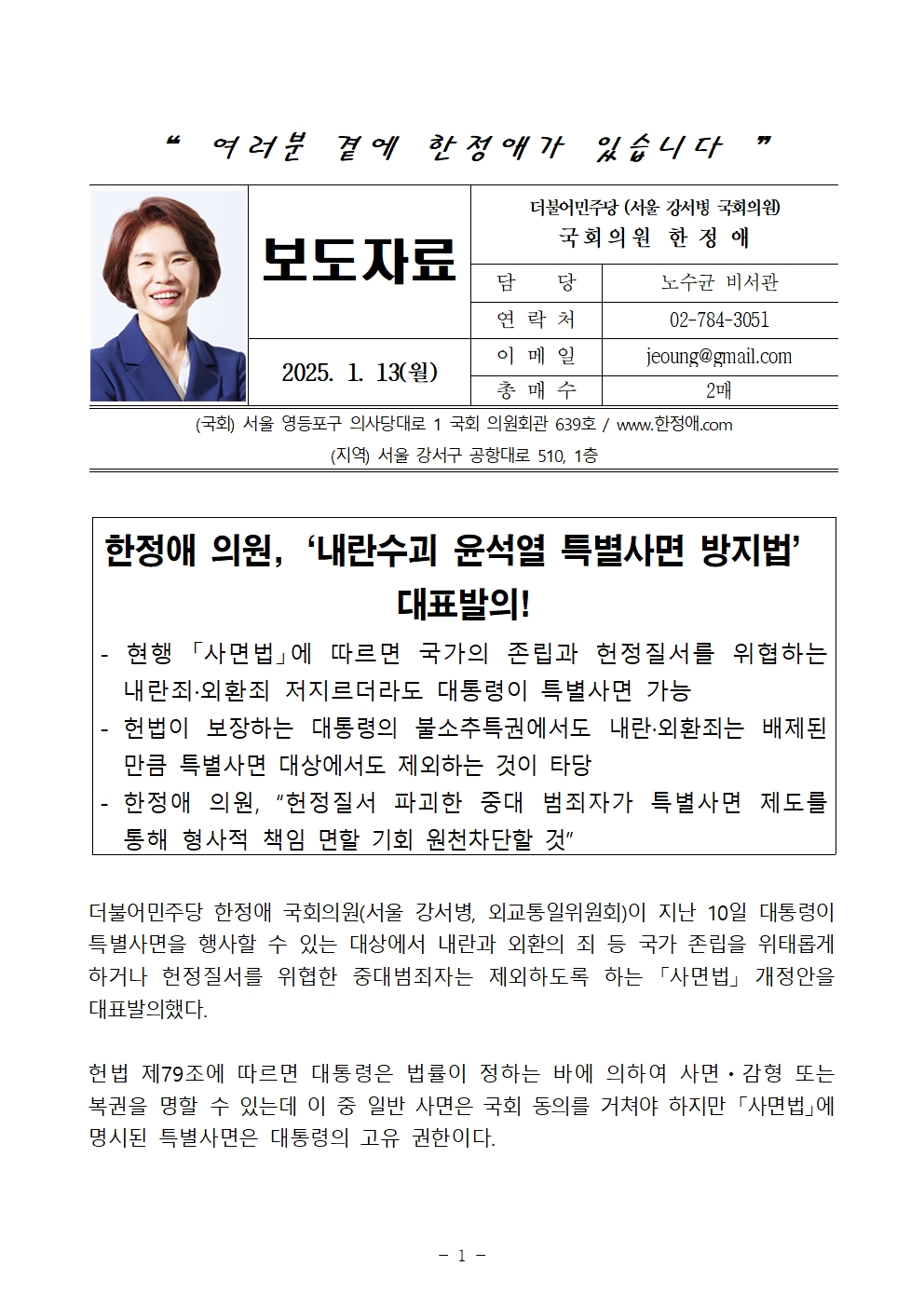 250113_[한정애의원 보도자료]_한정애 의원, 내란수괴 윤석열 특별사면 방지법 대표발의!.hwp