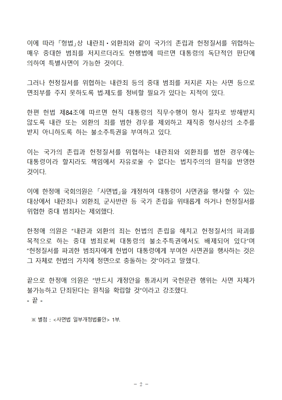 끝으로 한정애 의원은 “반드시 개정안을 통과시켜 국헌문란 행위는 사면 자체가 불가능하고 단죄된다는 원칙을 확립할 것”이라고 강조했다.