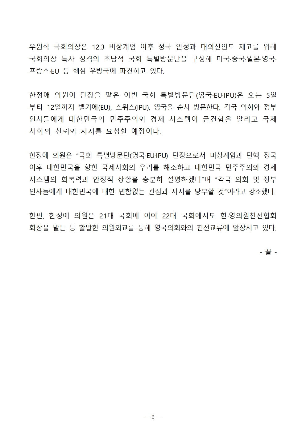 250203_[한정애의원 보도자료]_한정애 의원, 국회의장 특사단장으로 EU·IPU·영국 의회 방문해 한국에 대한 국제사회 우려 해소한다!.hwp