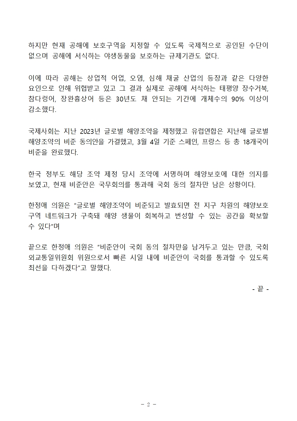한정애 의원은 “글로벌 해양조약이 비준되고 발효되면 전 지구 차원의 해양보호구역 네트워크가 구축돼 해양 생물이 회복하고 번성할 수 있는 공간을 확보할 수 있다”며