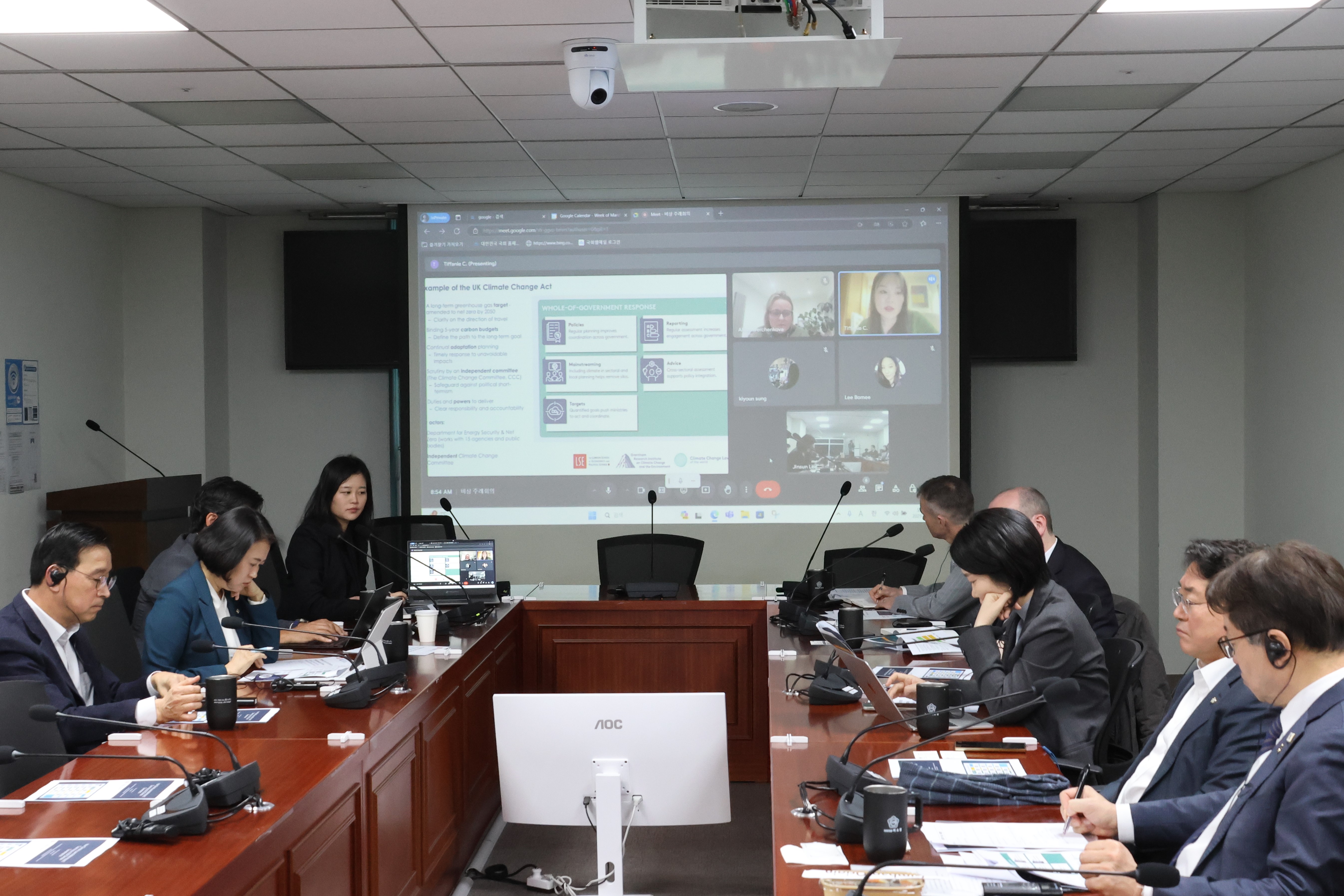 오늘 회의에서는 런던정경대(LSE) Alina Averchenkova 박사, Tiffanie Chan 박사, 옥스퍼드대학교 벤 칼데콧 박사로부터 ‘영국 기후 거버넌스 사례와 한국 정부 조직 개편 방향에 대한 시사점’을 들었습니다.