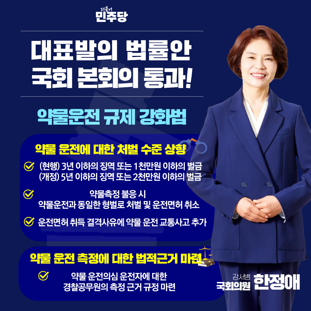 마약, 향정신성 의약품 등 약물운전에 대한 규제를 강화하기 위해 대표발의한 「도로교통법」 개정안이 13일 국회 본회의를 통과했습니다.