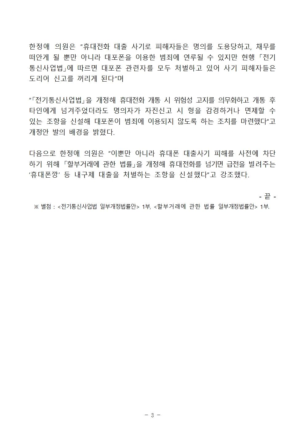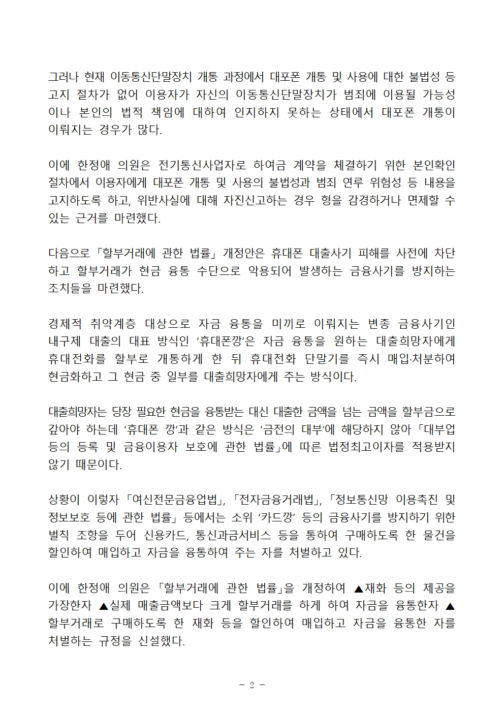 다음으로 한정애 의원은 이뿐만 아니라 휴대폰 대출사기 피해를 사전에 차단하기 위해 「할부거래에 관한 법률」을 개정해 휴대전화를 넘기면 급전을 빌려주는 ‘휴대폰깡’ 등 내구제 대출을 처벌하는 조항을 신설했다 고 강조했다.