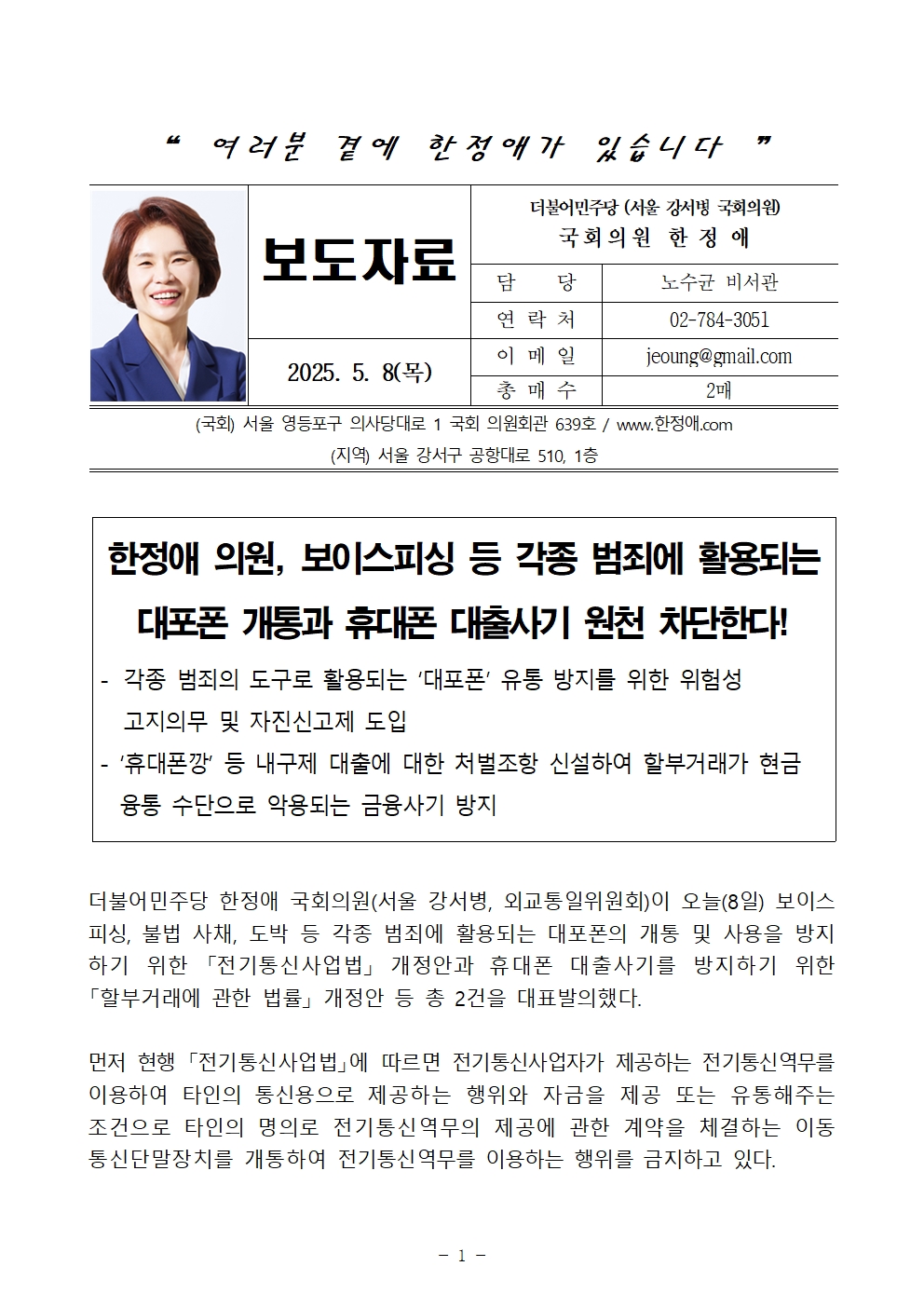 더불어민주당 한정애 국회의원(서울 강서병, 외교통일위원회)이 오늘(8일) 보이스피싱, 불법 사채, 도박 등 각종 범죄에 활용되는 대포폰의 개통 및 사용을 방지하기 위한 「전기통신사업법」 개정안과 휴대폰 대출사기를 방지하기 위한 「할부거래에 관한 법률」 개정안 등 총 2건을 대표발의했다.
