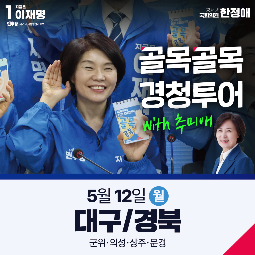 5.12.(월) 20대 대선 당시 이재명 후보가 전국에서 득표율이 가장 낮았던 대구/경북에서 첫번째 골목골목 경청투어를 시작합니다! 산불 피해 주민과의 만남, 귀농 청년과의 만남 등 우리 사회에 필요한 정책은 무엇인지 열심히 돌아다니며 경청하겠습니다!