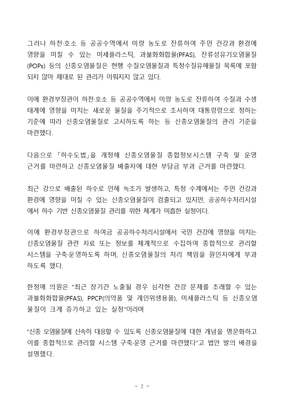 한정애 의원은 “최근 장기간 노출될 경우 심각한 건강 문제를 초래할 수 있는 과불화화합물(PFAS), PPCP(의약품 및 개인위생용품), 미세플라스틱 등 신종오염물질이 크게 증가하고 있는 실정”이라며