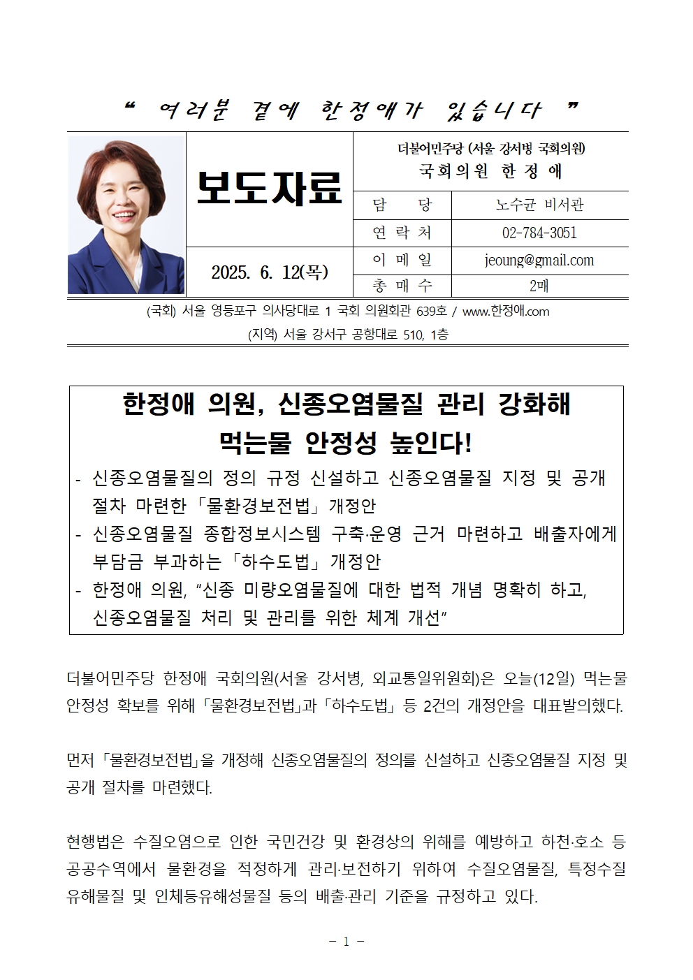 250612_[한정애의원 보도자료]_한정애 의원, 신종오염물질 관리 강화해 먹는물 안정성 높인다!.hwp
