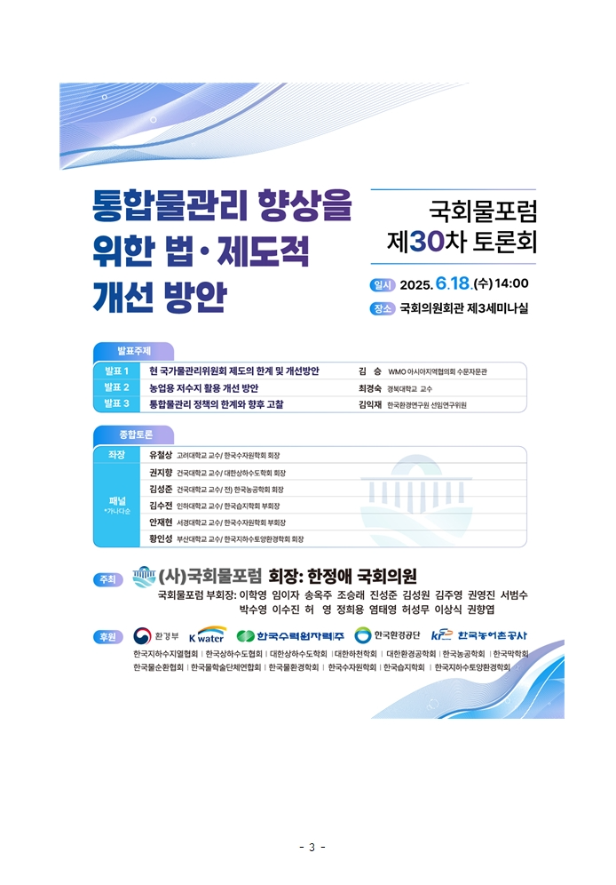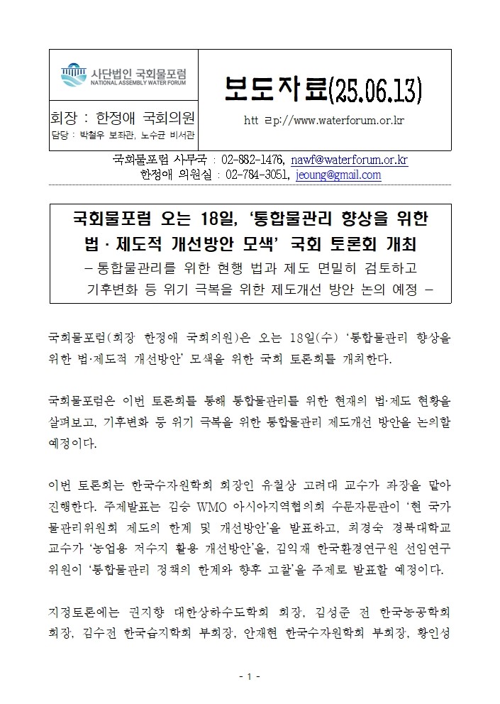 250613_국회물포럼 오는 18일, ‘통합물관리 향상을 위한 법·제도적 개선방안 모색’국회 토론회 개최.hwp