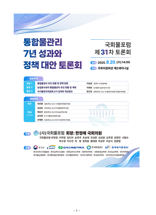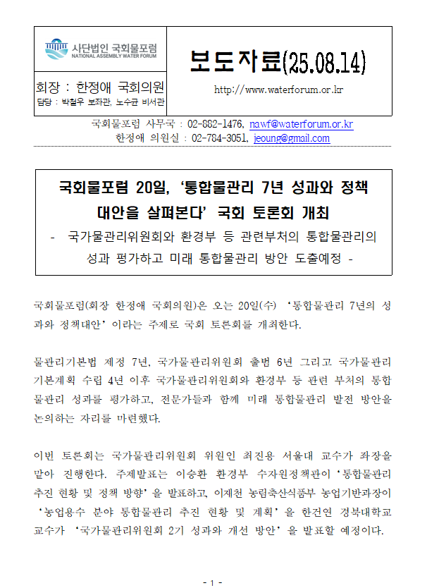 250814_국회물포럼, ‘통합물관리 7년 성과와 정책 대안을 살펴본다’국회 토론회 개최.hwp