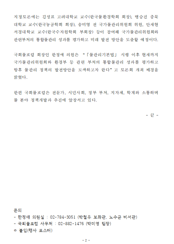 [보도자료] 국회물포럼 20일, '통합물관리 7년 성과와 정책 대안을 살펴본다' 국회 토론회 개최