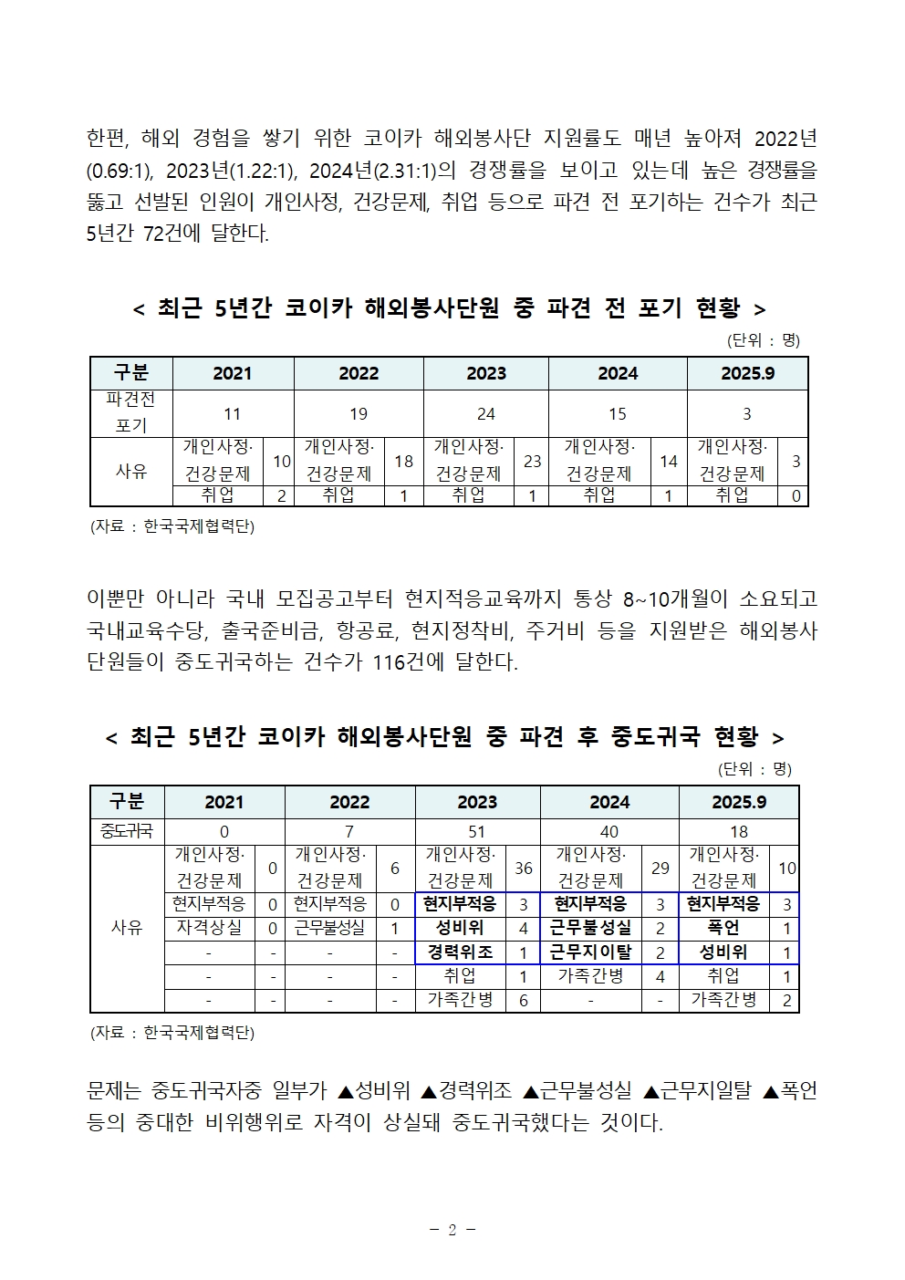 [보도자료] 연간 537억 투입되는 코이카 해외 봉사단, 지난 5년간 단원 188명 파견 전 포기하거나 중도귀국했다!