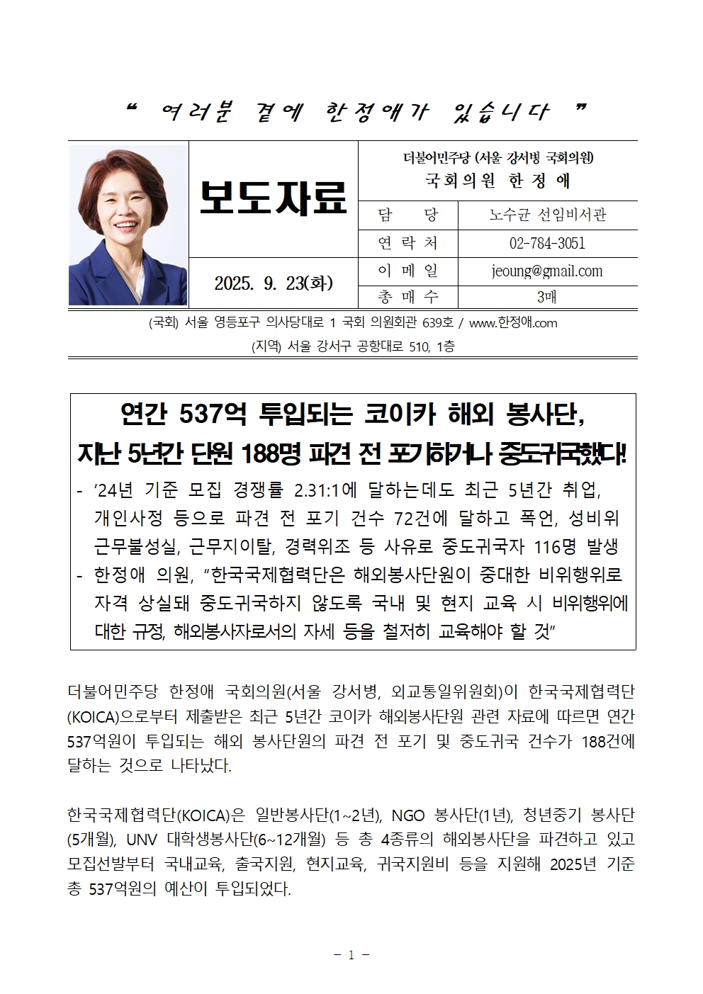 250923_[한정애의원 국정감사 보도자료]_연간 537억 투입되는 코이카 해외 봉사단, 지난 5년간 단원 188명 파견 전 포기하거나 중도귀국했다!.hwp