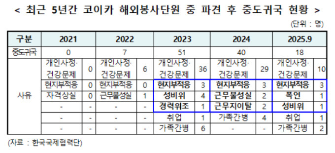일부 지원을 받은 해외봉사단이 중도에 귀국하는 건수도 116건이나 됐다. 국내 모집공고부터 현지적응교육 등 이들을 파견하기까지 통상 8~10개월이 걸리고 국내교육수당, 출국준비금, 항공료, 현지정착비, 주거비 등을 지원했으나 중도에 포기한 것이다. ▲2021년 0건 ▲2022년 7건 ▲2023년 51건 ▲2024년 40건 ▲2025년 9월 기준 18건이다.