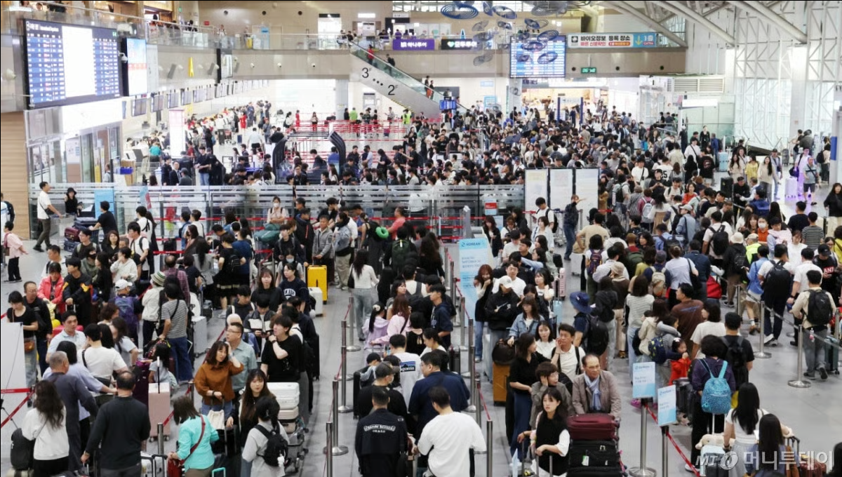 추석 연휴를 앞둔 2일 부산 강서구 김해국제공항 국제선 청사에서 해외여행을 떠나는 시민들이 출국 수속을 하고 있다. 이번 추석 연휴 기간(2~12일) 전국 15개 공항 이용객은 역대 명절 연휴 최대인 약 526만명에 달할 것으로 전망됐다. 인천공항이 245만명, 김포·김해·제주 등 14개 공항이 281만명(국내선 206만명, 국제선 75만명)으로 예상됐다. 한국공항공사는 국제선 출발 2시간 전까지 공항 도착을 권고했다. 2025.10.02.