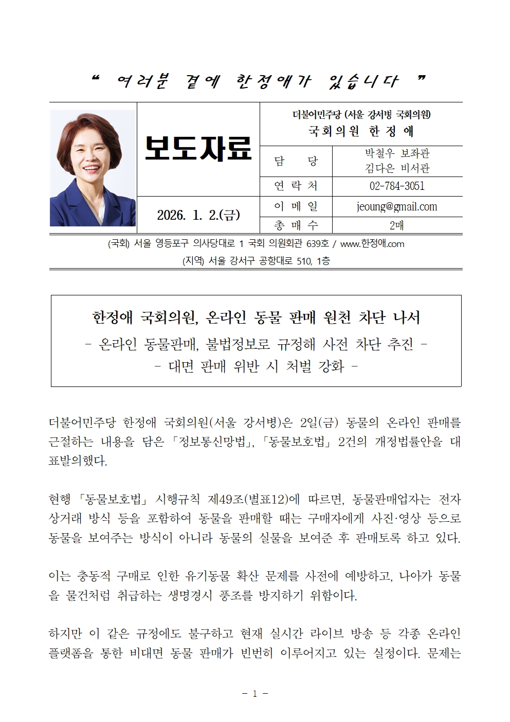 더불어민주당 한정애 국회의원(서울 강서병)은 2일(금) 동물의 온라인 판매를 근절하는 내용을 담은 「정보통신망법」, 「동물보호법」 2건의 개정법률안을 대표발의했다.