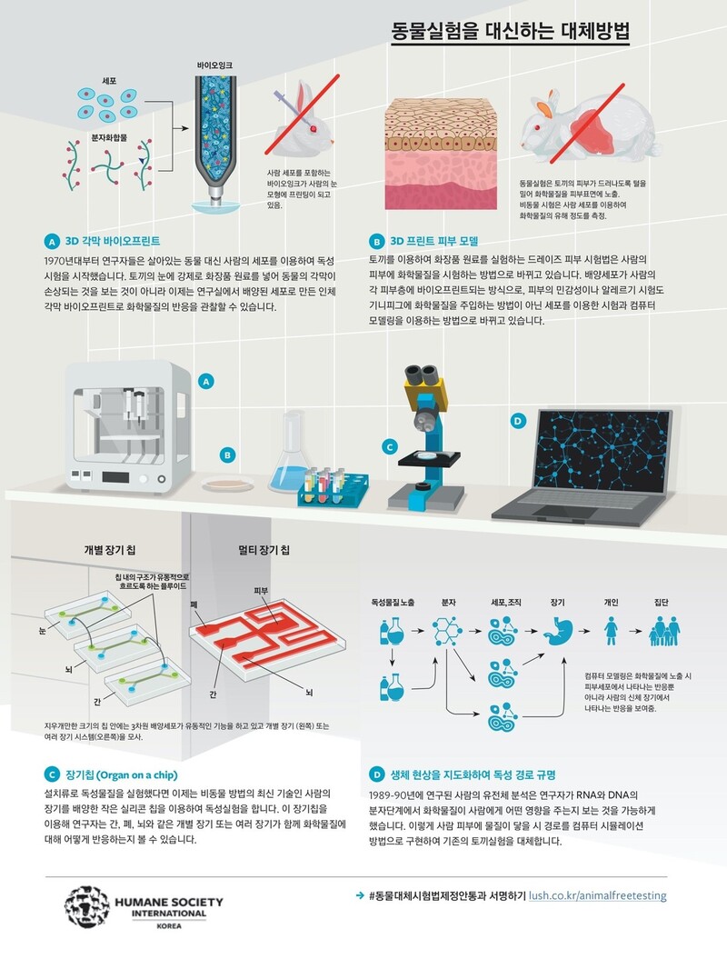 2021년 9월 환경부는 동물대체시험법 활성화 실행계획 토론회를 온라인으로 개최했다. 환경부는 지난해 초 한정애 장관 취임 이후로 ‘화학안전평가에 있어 동물대체시험법 활성화 논의를 위한 태스크포스(TF)’를 꾸린 데 이어, 이번 토론회에서 ‘2030 화학안전과 함께하는 동물복지 실현 비전’을 소개했다.