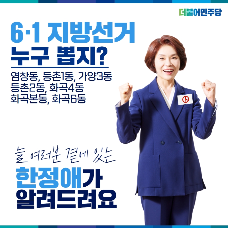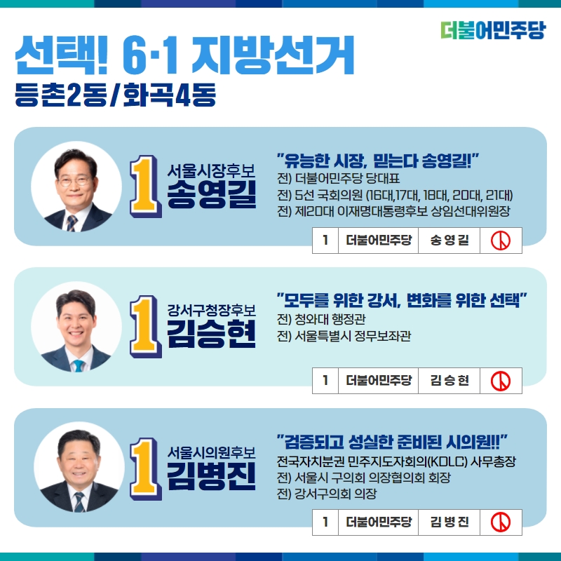 우리 후보들과 함께 누구도 소외되지 않고, 고루 발전하는 강서를 만들겠습니다.