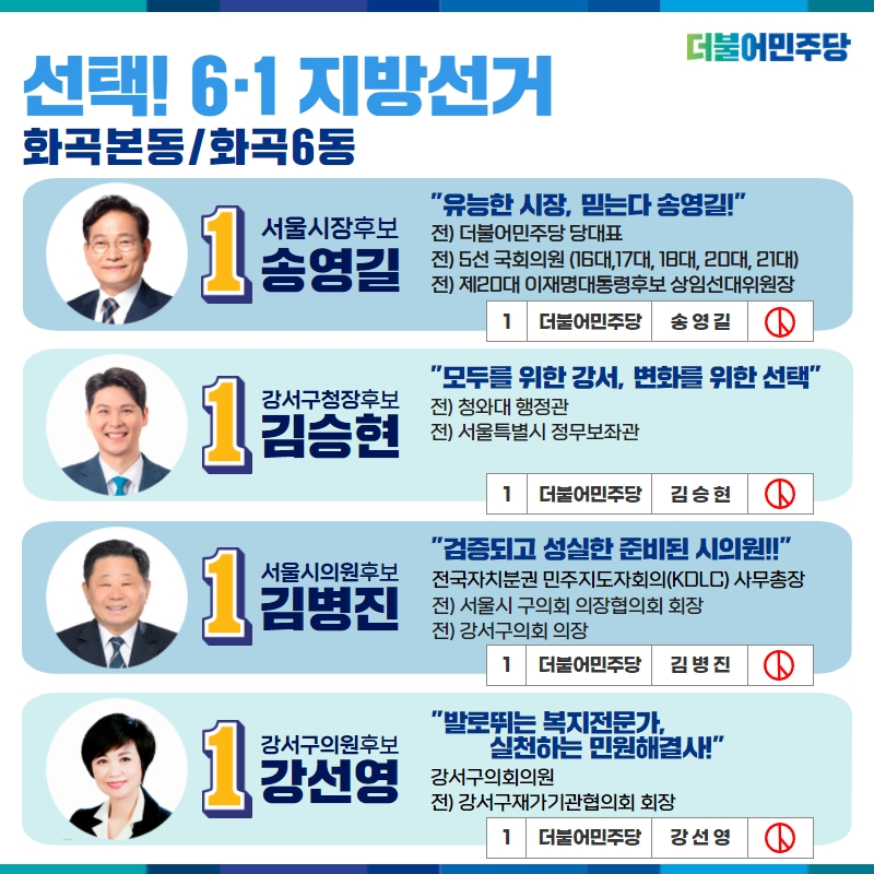 우리 후보들과 함께 누구도 소외되지 않고, 고루 발전하는 강서를 만들겠습니다.