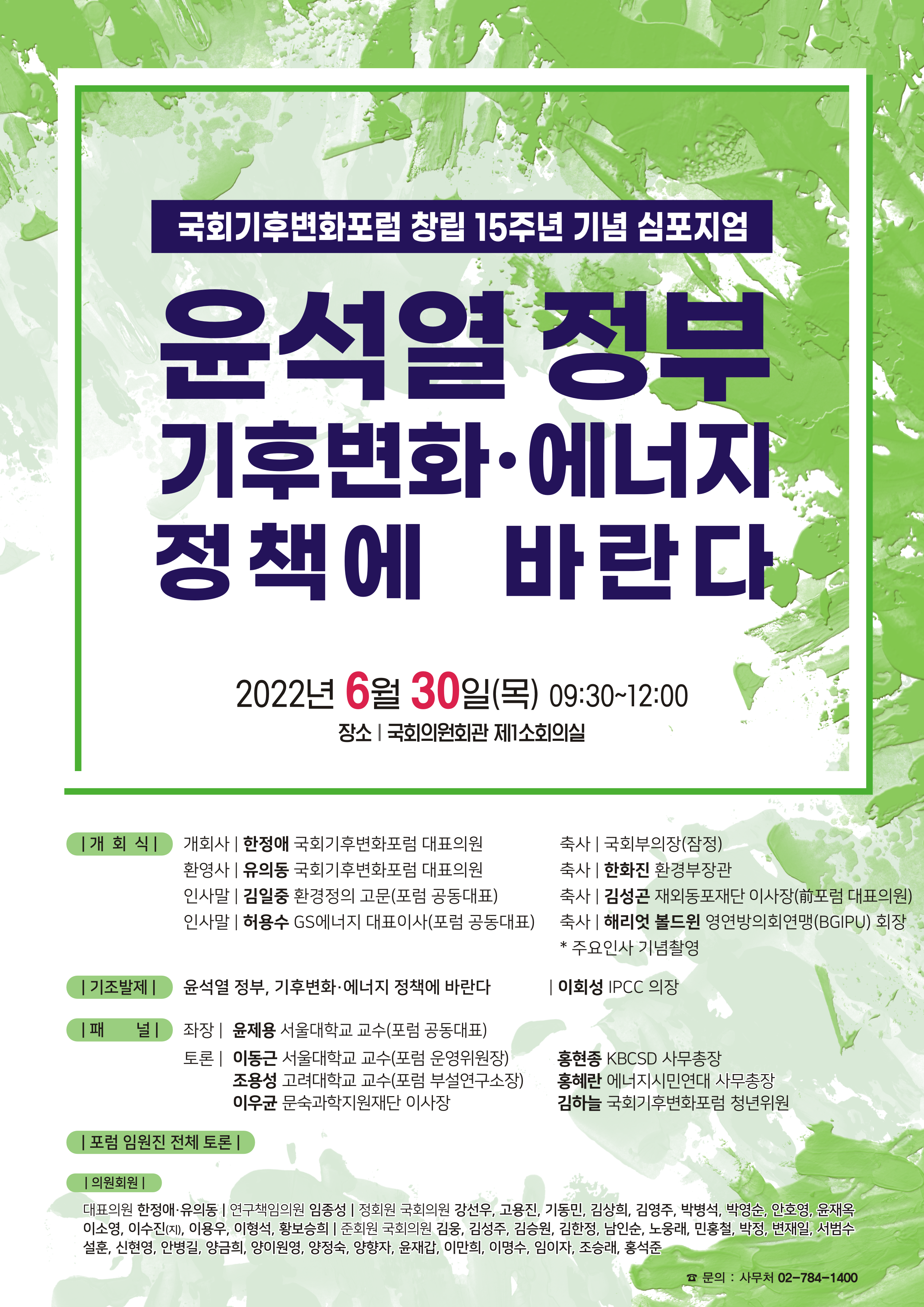 국회기후변화포럼은 다가오는 30일(목) 국회의원회관 제1소회의실에서 '윤석열 정부 기후변화·에너지 정책에 바란다'를 주제로 창립 15주년 기념 심포지엄을 개최합니다.