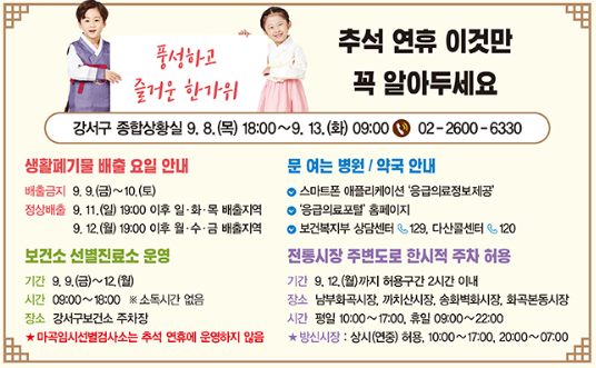 강서는 주민들이 편안하고 안전한 명절을 보낼 수 있도록 종합상황실을 연휴 기간 운영한다고 합니다.
