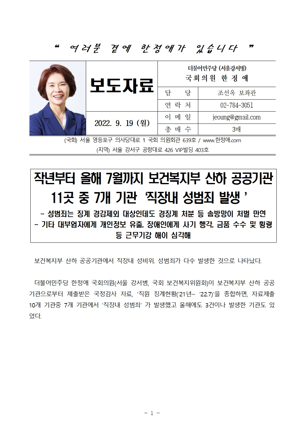 220919 [한정애의원 보도자료] 보건복지부 산하기관 직장내성범죄, 개인정보유출 등 도덕적 해이 심각해(수정).hwp