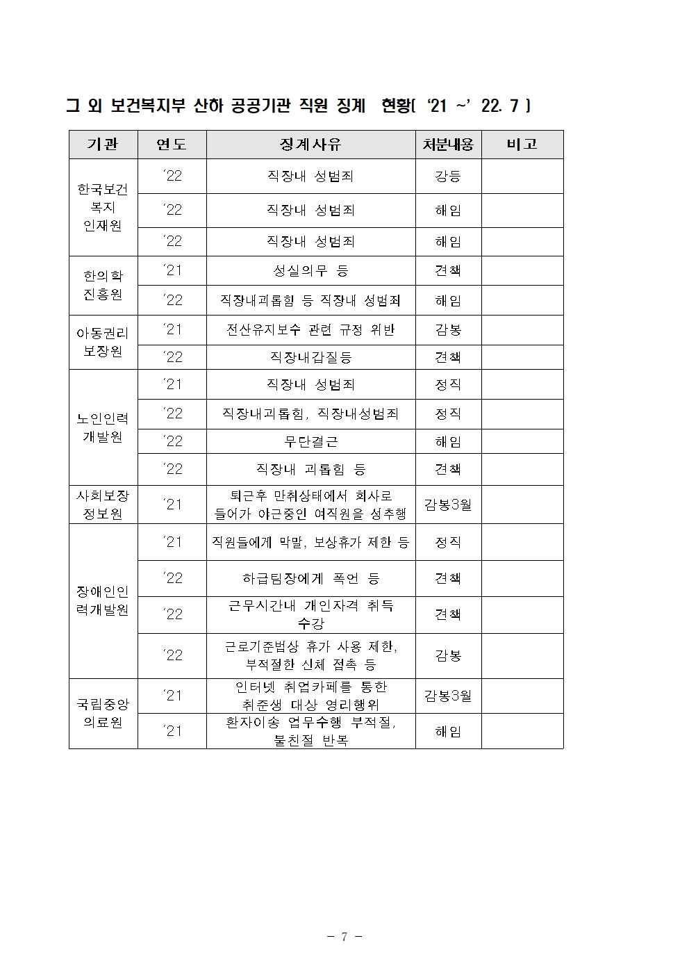 더불어민주당 한정애 국회의원(서울 강서병, 국회 보건복지위원회)이 보건복지부 산하 공공기관으로부터 제출받은 국정감사 자료, ‘직원 징계현황(’21년~ ‘22.7)’을 종합하면, 자료제출 10개 기관중 7개 기관에서 ‘직장내 성범죄’ 가 발생했고 올해에도 3건이나 발생한 기관도 있었다.