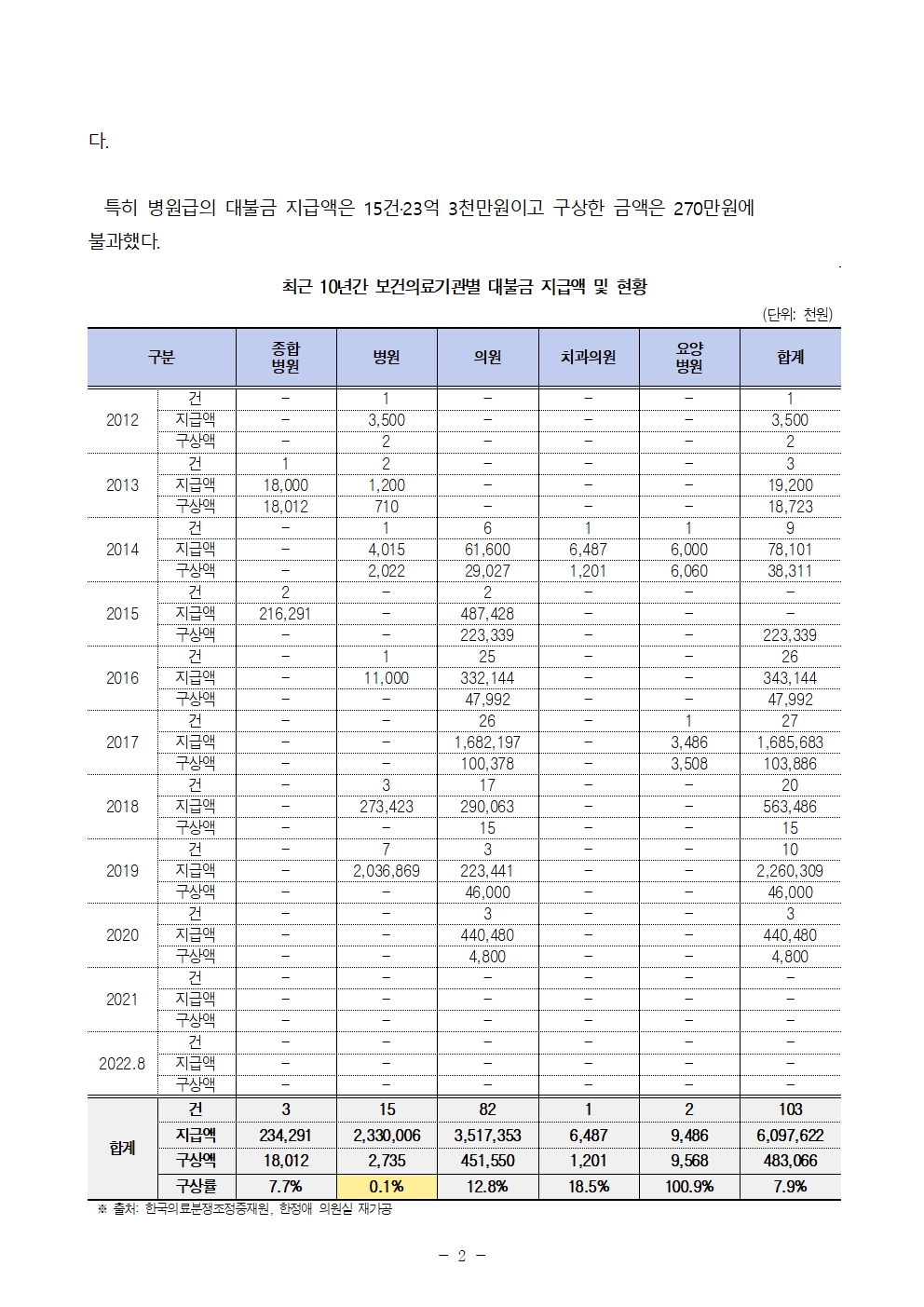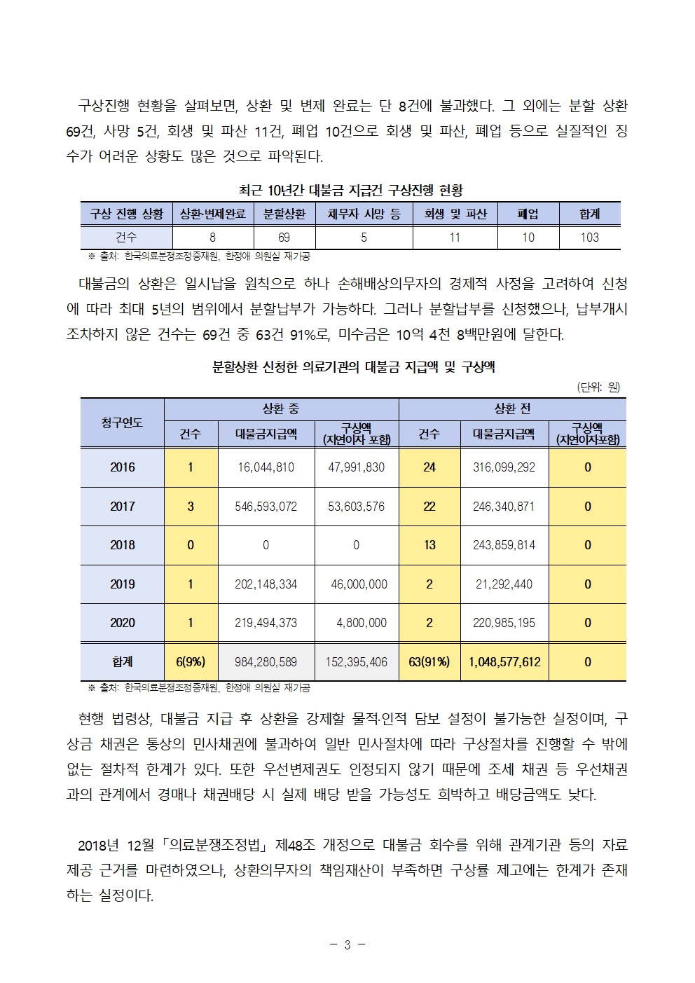 더불어민주당 한정애 국회의원(서울 강서병, 국회 보건복지위원회)이 한국의료분쟁조정중재원으로부터 제출받은 국정감사 자료에 따르면, 한국의료분쟁조정원이 설립된 2012년부터 2022년까지 의료사고 피해자가 조정원에 청구한 손해배상에 대하여 조정원은 총 103건에 대해 우선 61억원을 지급하였으나 의료기관으로부터 상환 받은 금액은 4억 8천만원으로 8%에 불과한 것으로 나타났다.