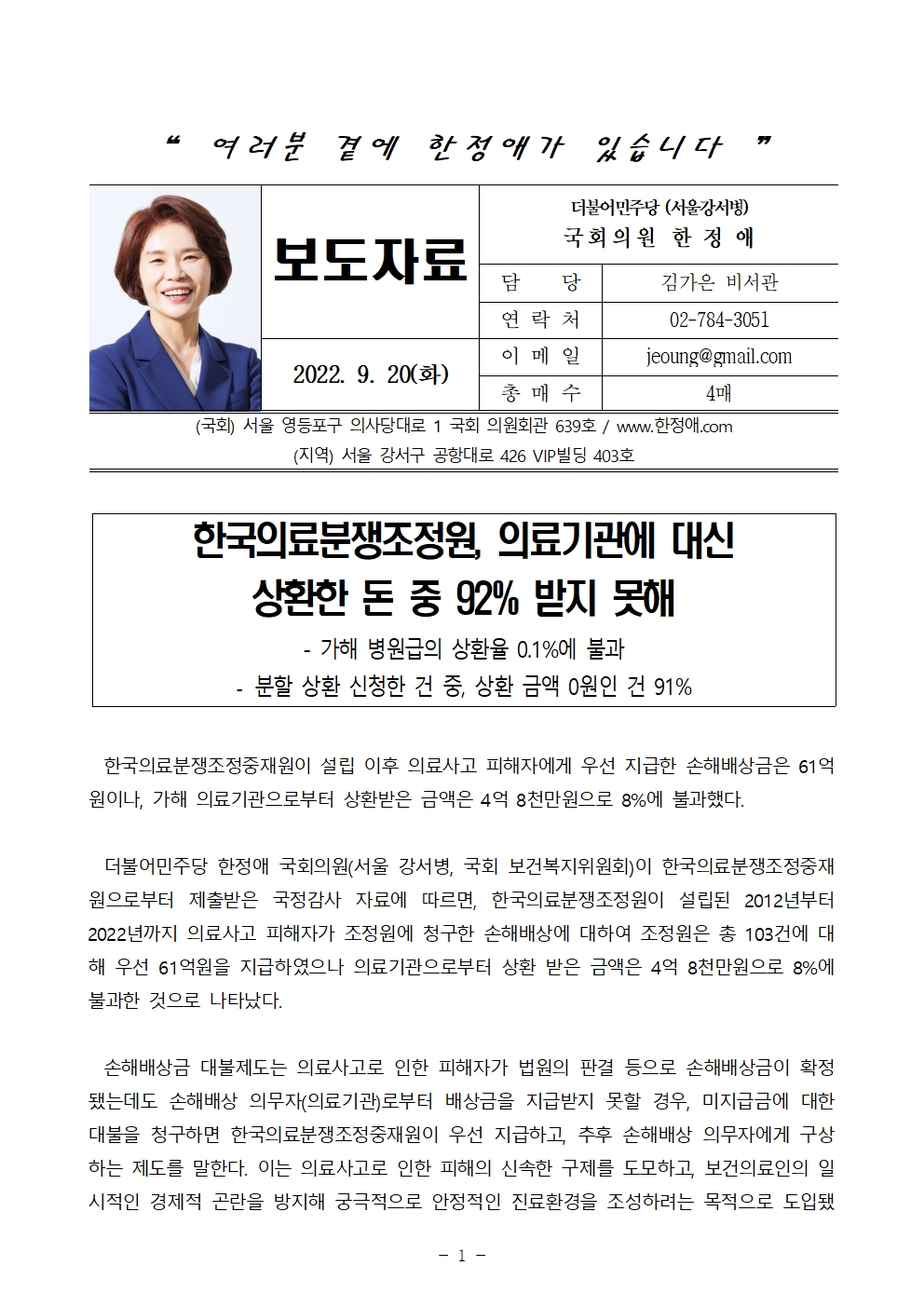 220920_[보도자료] 한국의료분쟁조정원, 의료기관에 대신 상환한 돈 중 92% 받지 못해(수정본).hwp
