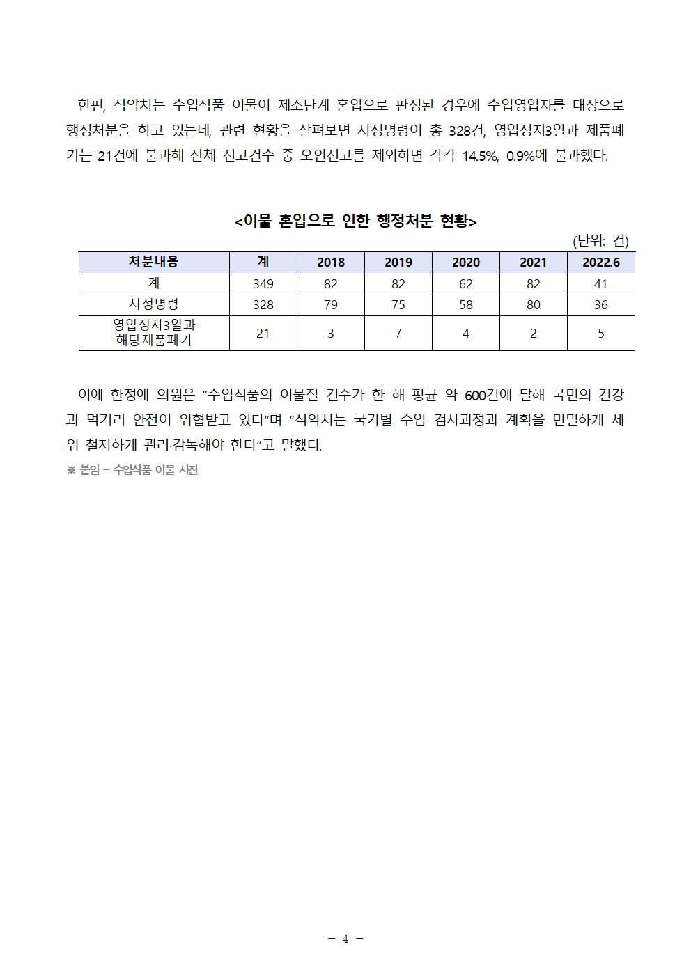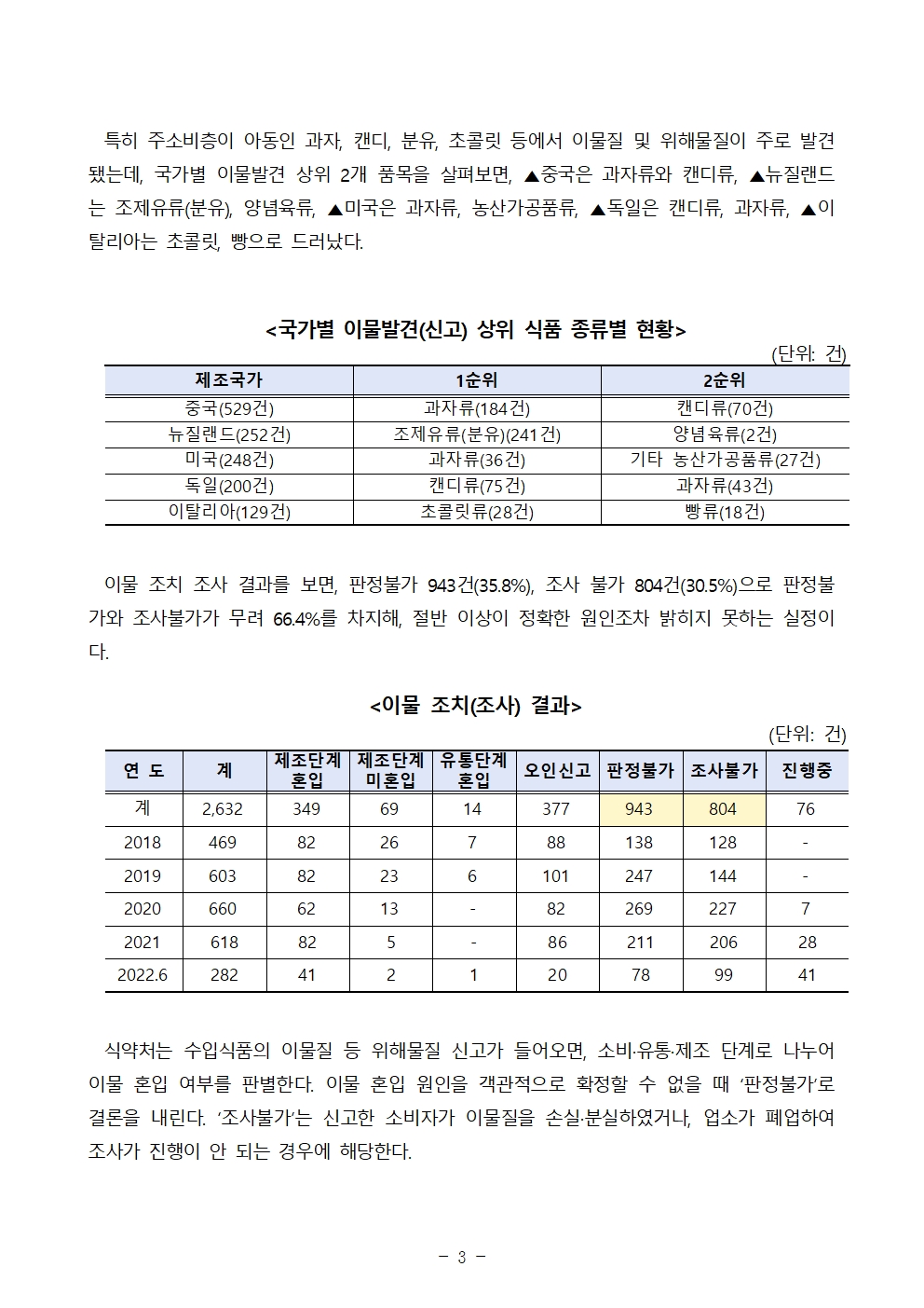 더불어민주당 한정애 국회의원(서울 강서병, 국회 보건복지위원회)이 식품의약품안전처로부터 제출받은 국정감사 자료에 따르면, 2018년부터 2022년 6월까지 수입식품 중 이물질 등 위해물질 발견 신고 건수가 총 2,632건에 달하는 것으로 나타났다.