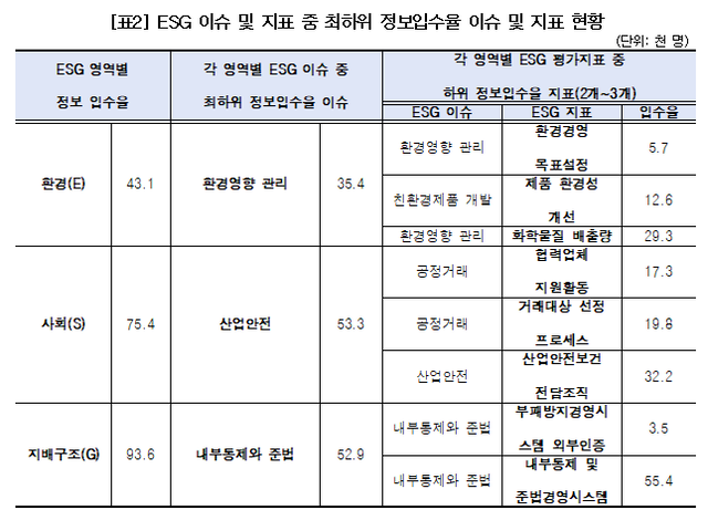 구체적인 평가지표별 정보 입수율을 보면 △환경 영역에서는 환경경영 목표 설정(5.7%), 제품환경성 개선(12.6%), 화학물질 배출량(29.3%) 지표 △사회 영역에서는 협력업체 지원활동(17.3%), 거래대상 선정 프로세스(19.8%), 산업안전보건 전담조직(32.2%) 지표 △지배구조 영역에서는 부패방지경영시스템 외부 인증(3.5%), 내부통제 및 준법경영시스템(55.4%)이 각 영역의 다른 지표보다도 현저히 떨어졌다.